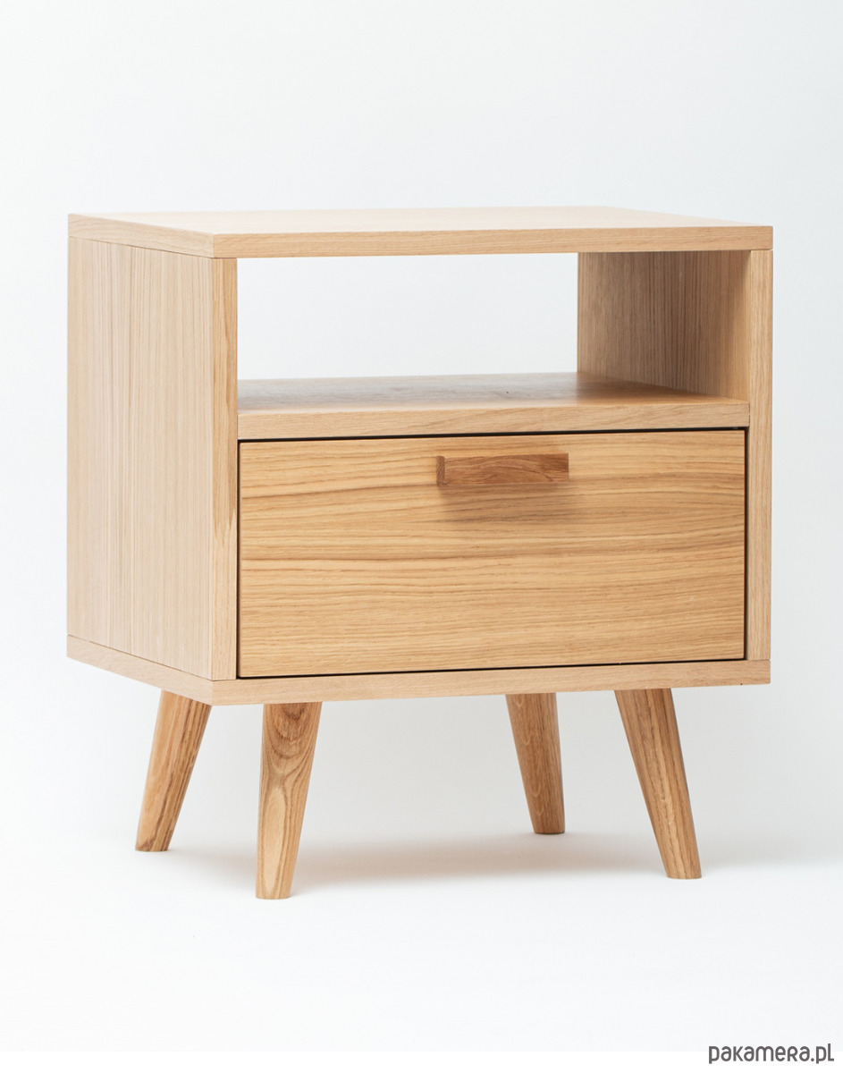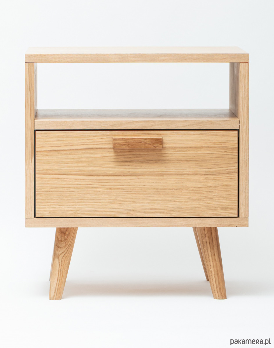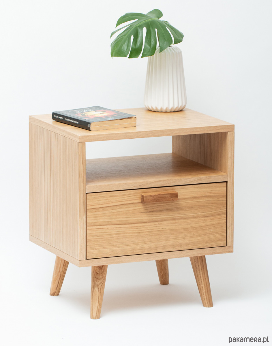 Szafka wyposażona została w pojemną półkę wykonaną z klasycznej płyty meblowej w kolorze białym (gr.18mm) z frontem barkowym fornirowanym, w której z łatwością zmieszczą się podręczne przedmioty jak np. ładowarki, książki, tablet itp.