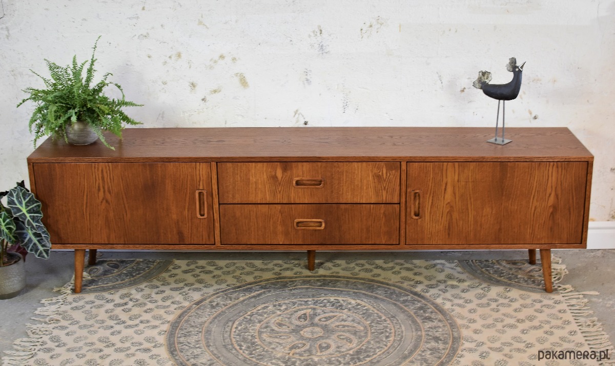 Komoda została podzielona na trzy równe części. W części prawej oraz lewej znajduję się jedna półka z możliwością regulacji w zakresie 5 cm w górę oraz dół. W środkowej części znajdują się dwie szuflady. Każda z nich ma wysokość 12 cm.
