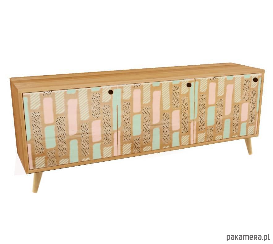 Zakrocka Design - ręcznie tworzona komoda 3 drzwiowa w stylu MId-century z laminowanym malunkiem tłoczonym w drewnie