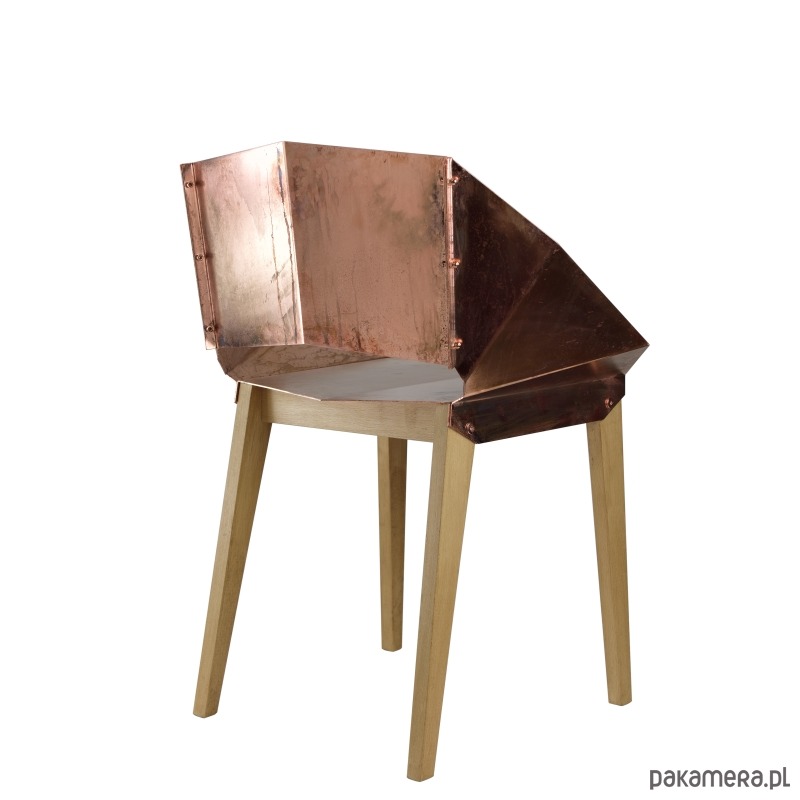 Nietuzinkowe krzesło o nowoczesnej formie. Stworzone z giętych elementów stalowych. Oryginalny, miedziany kolor, ukazany wraz z jej autentycznymi przebarwieniami. Bukowe, ręcznie woskowane nogi. Produkt wytwarzany w Polsce.