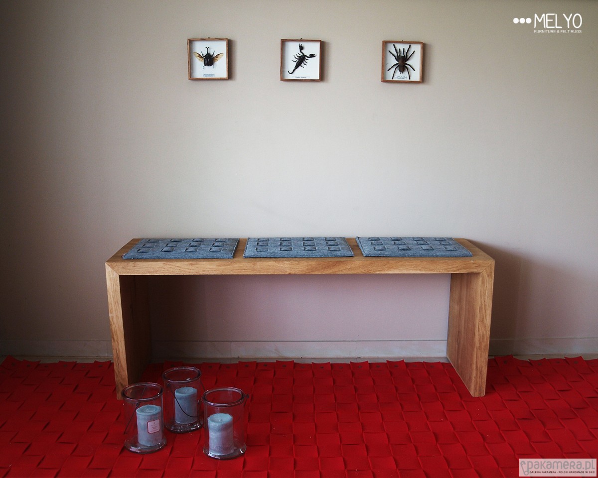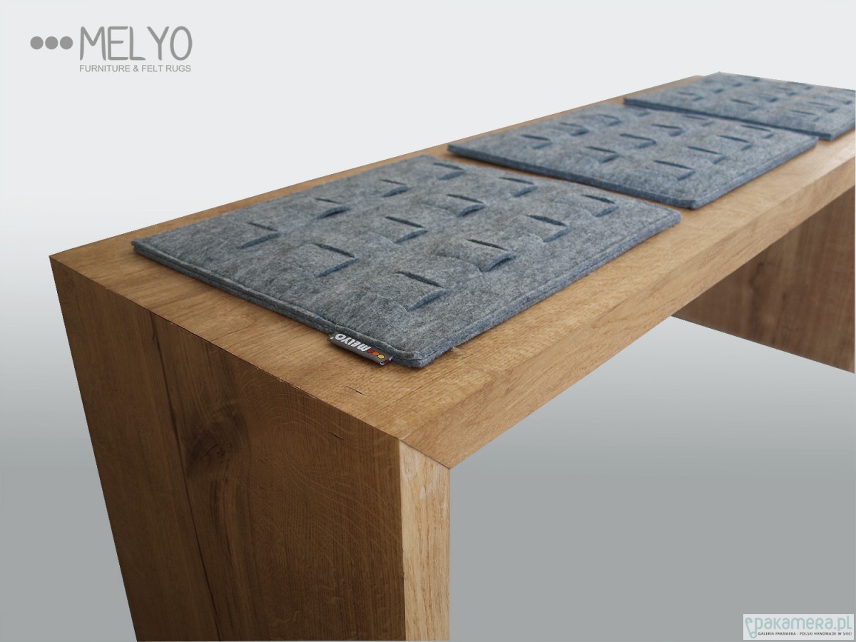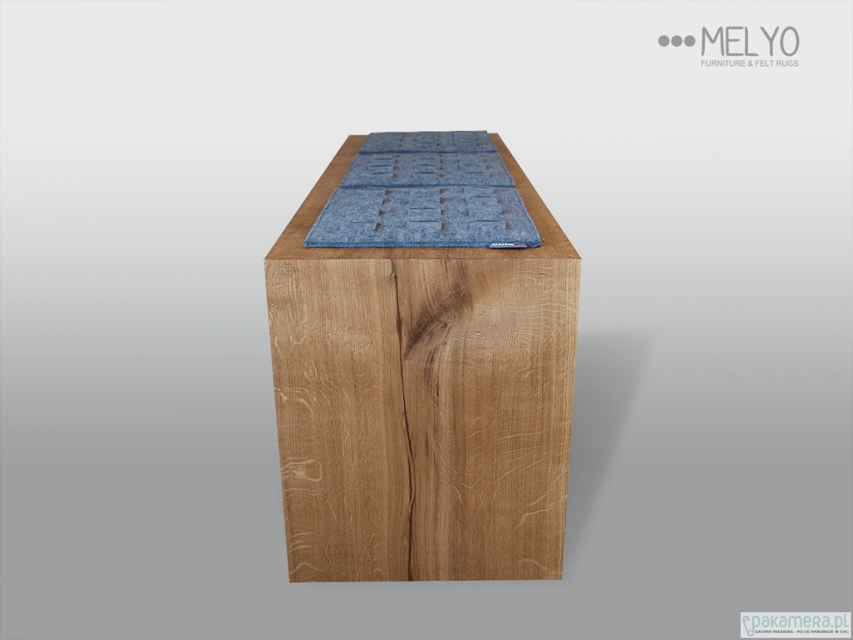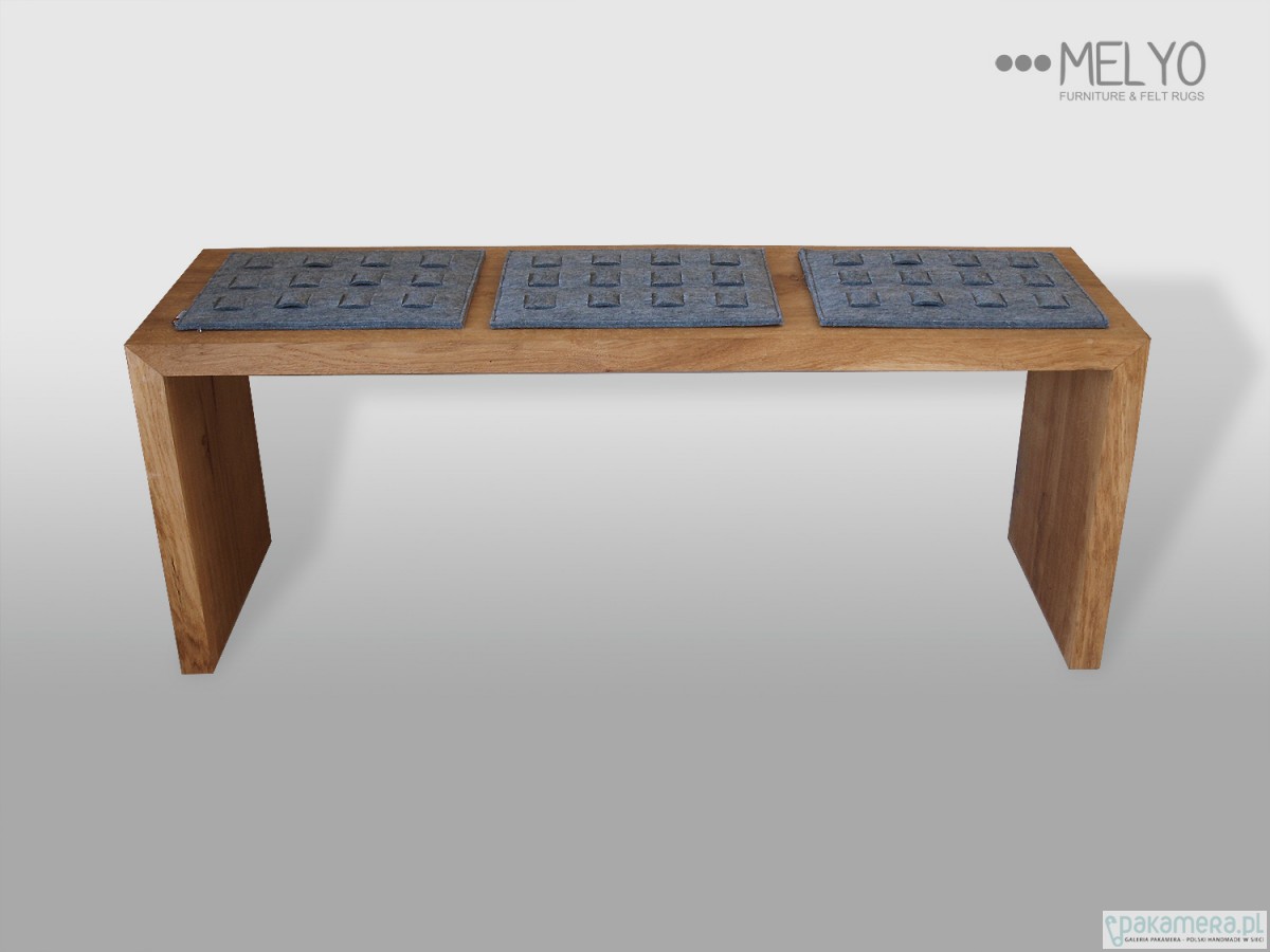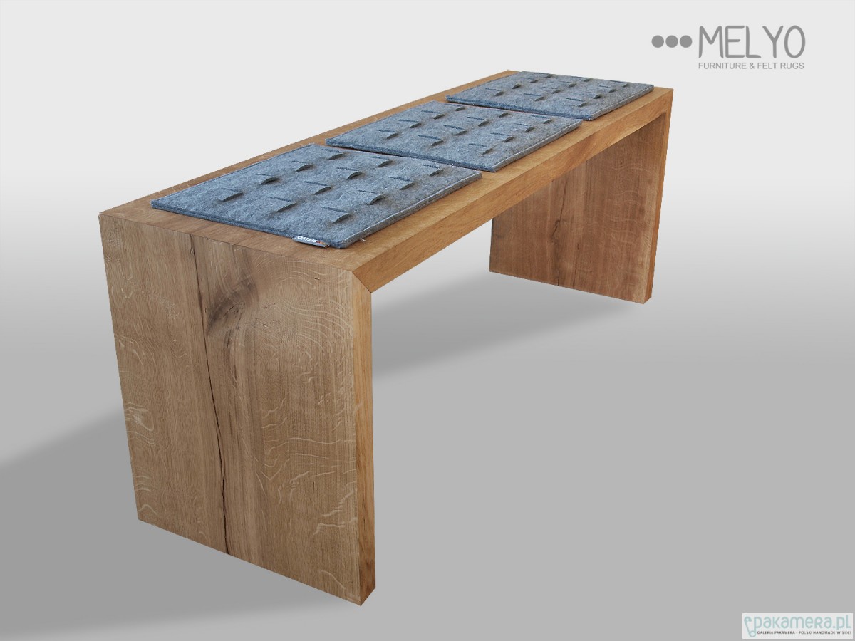 CLASSIC - projekt Grzegorz Korzeń (2014). Klasyczna ławka w minimalistycznym stylu idealna do przedpokoju , salonu, sypialni czy też butiku. Ławka wyposażona w trzy oryginalne filcowe poduszki grubości 1,5 cm. Blat oraz nogi ławki wykonane z litego drewna dębowego grubości 4,5 cm, pokryte bezbarwnym lakierem by uwidocznić strukturę drewna. Wymiary ławki 110x39 cm., wys. 49 cm Istnieje możliwość zamówienia ławki o innej długość, oraz wyboru koloru podkładek (czarne, grafitowe, brązowe , białe, ecru, niebieskie, fioletowe, różowe, czerwone, żółte, seledynowe).
