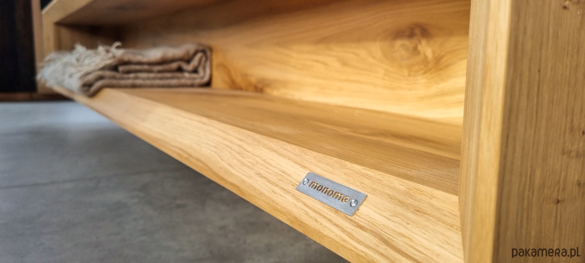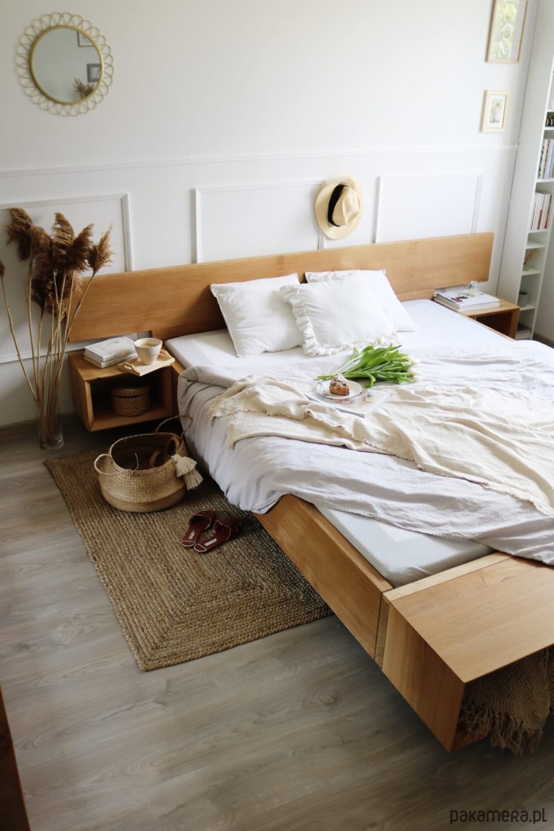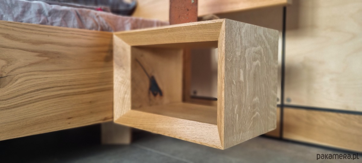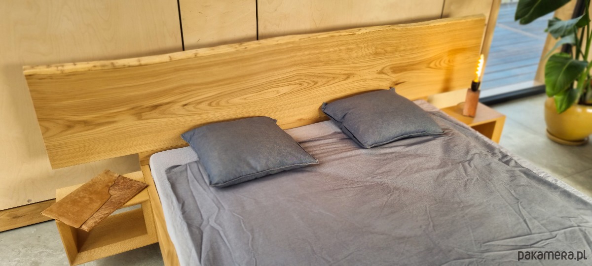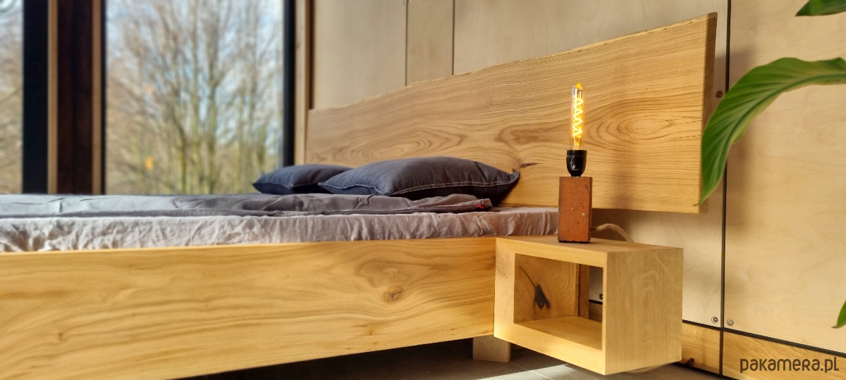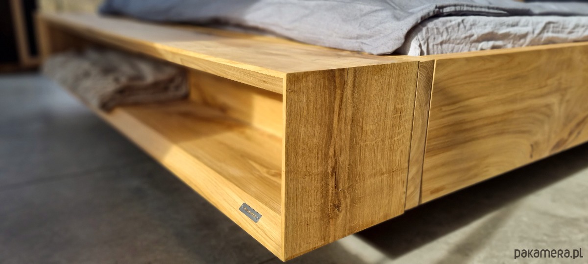 Łóżko dębowe z litego drewna. Dwie szafki nocne przymocowane do ramy łóżka, oraz pólka przymocowana od strony nóg. Unikalny i oryginalny styl. Wykonane ręcznie z uwagą na detale. Wosk nadaje ciepły kolor i jest przyjemny w dotyku. Każdy drewniany element jest specjalnie wyselekcjonowany aby nadać niepowtarzalny wzór naszym łóżkom. Każdy nasz mebel jest wykonany ręcznie i z pasją.