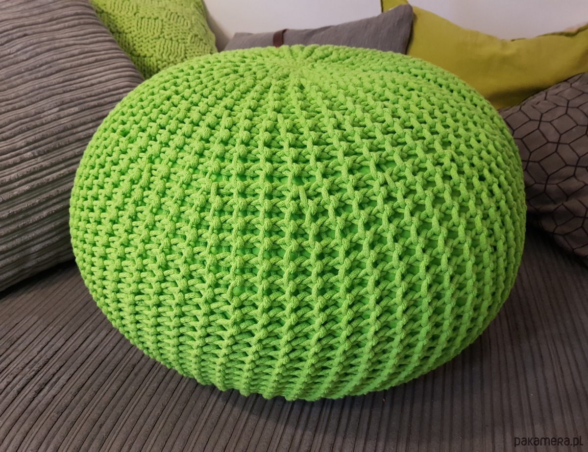 Puf zrobiony na drutach z miękkiego bawełnianego sznurka.