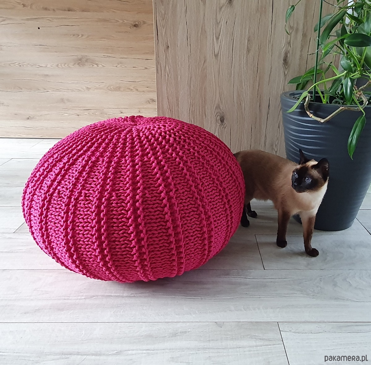 Puf zrobiony na drutach z miękkiego bawełnianego sznurka.
