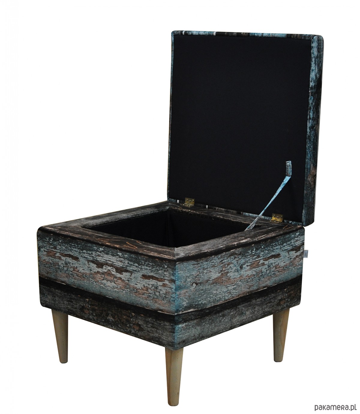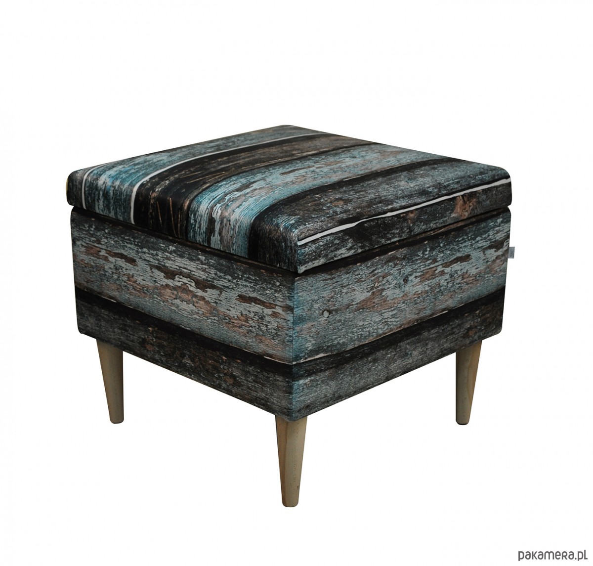 Pufa BOX old wood otwierana ze schowkiem z kolekji Concept 2014/2015 Materiał: luksusowa tkanina obiciowa ( łatwa w czyszczeniu) wzór stare deski Nogi: drewno lchowe Wymiary : 55 x 55 cm wyskość: 50 cm