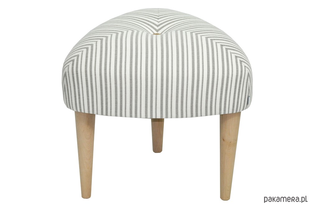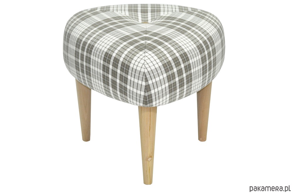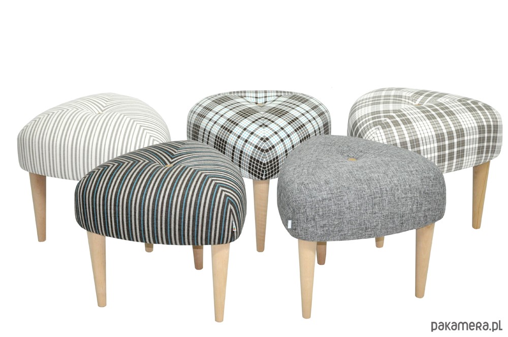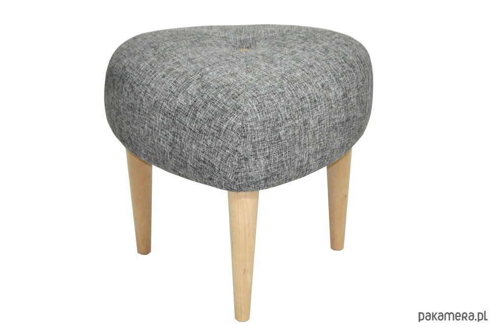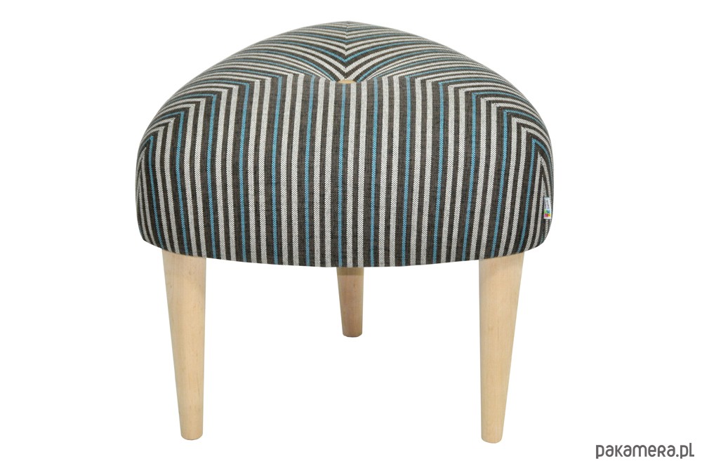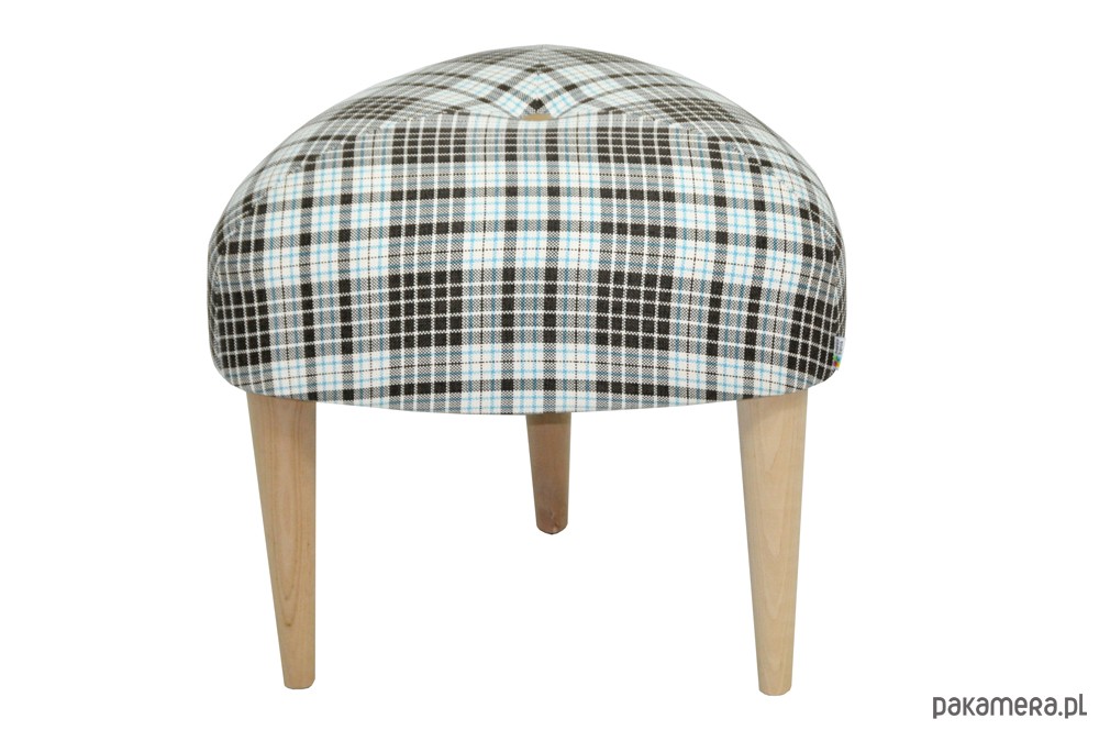 Zgrabny stołek na trzech nogach inspirowany wzornictwem lat 50/60-tych Design : Katarzyna Jasyk Wymiary : 45x45x45 wys.40 , wys. nogi 24 cm Pokrycie: tkanina tapicerska Nogi drewniane ( tapicerowane tkaniną) lub drewno woskowane. Pikowany guzikiem. Klienci mogą zadecydowac o kolorze nóg Stołek jest wygodny i stabilny. Różne obicia do wyboru.