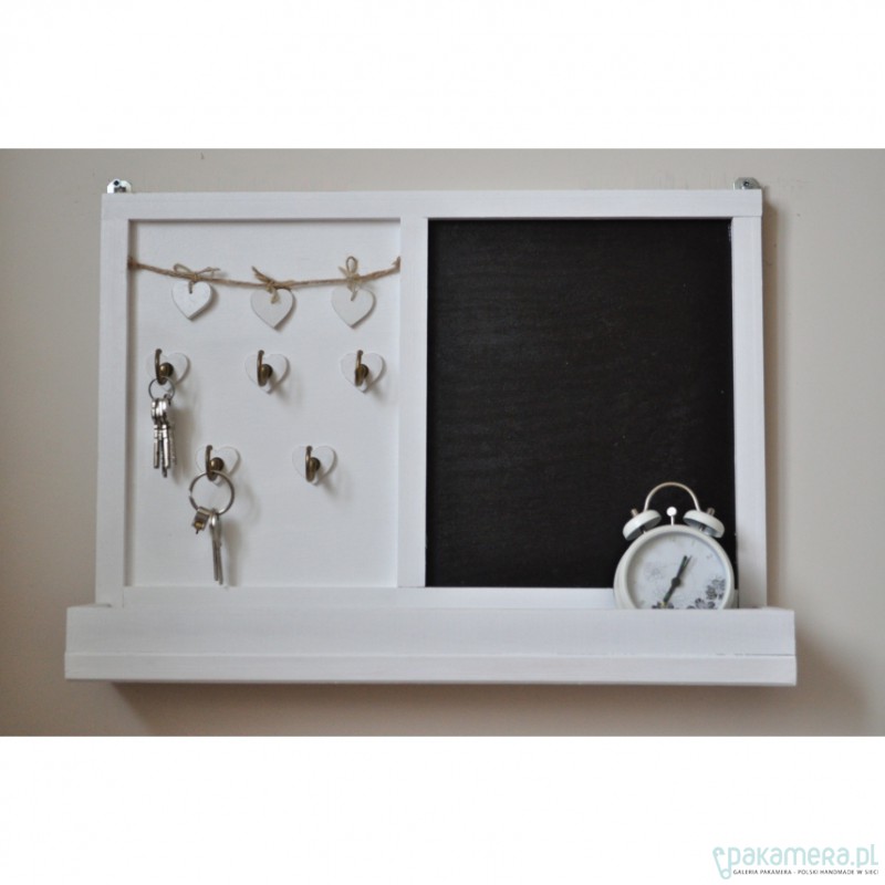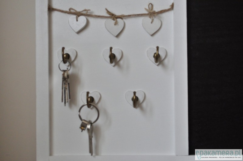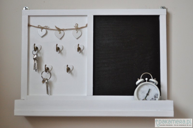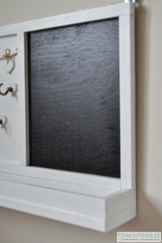 Półka została wykonana z drewna sosnowego i pomalowana na biało. Idealnie nadaje się do przedpokoju. Na tablicy można zapisywać ważne informacje, na haczykach umieszczonych na serduszkach wyciętych z drewnianej sklejki wieszać klucze. Półeczka ozdobiona jest serduszkami wyciętymi z drewnianej sklejki i zawieszonymi na sznureczkach. Wymiary: wys. 37 cm, szer. 55 cm, gł. 10 cm.