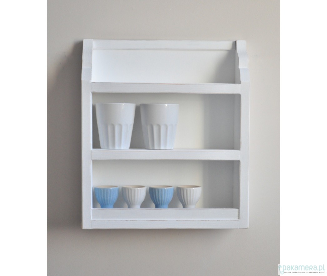 Półka została wykonana ręcznie z drewna sosnowego, pomalowana na biało i przetarta na krawędziach. Wymiary: wys. 36 cm, szer. 33 cm, szer.10 cm.