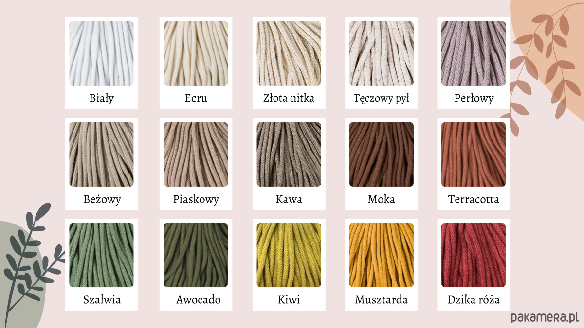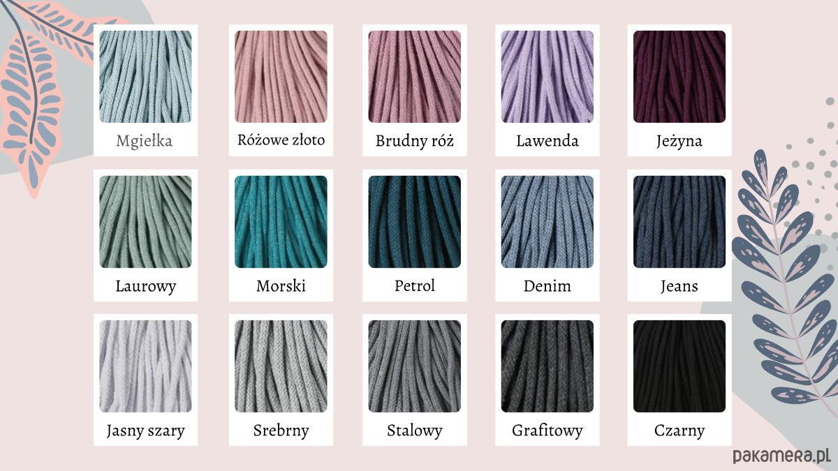 Najwyższej jakości sznurek bawełniany, bez poliestrowego wypełnienia (posiada certyfikat OEKO-TEX standard 100 - bezpieczeństwa i ochrony przed szkodliwymi substancjami chemicznymi.) Możliwość wyboru jednego z 30 kolorów.