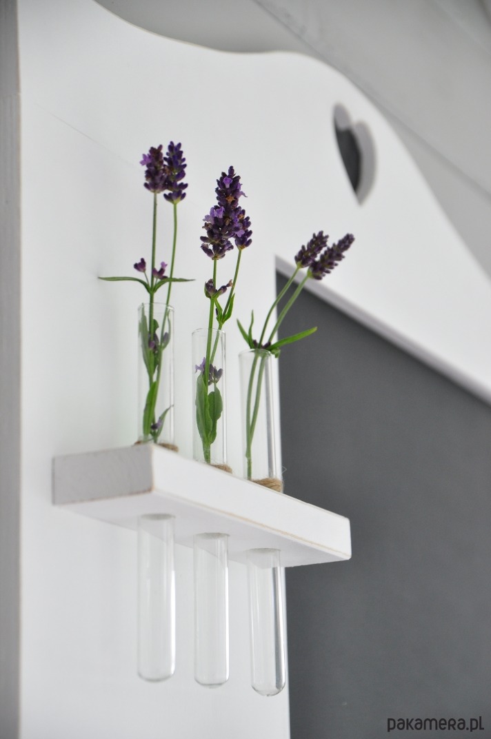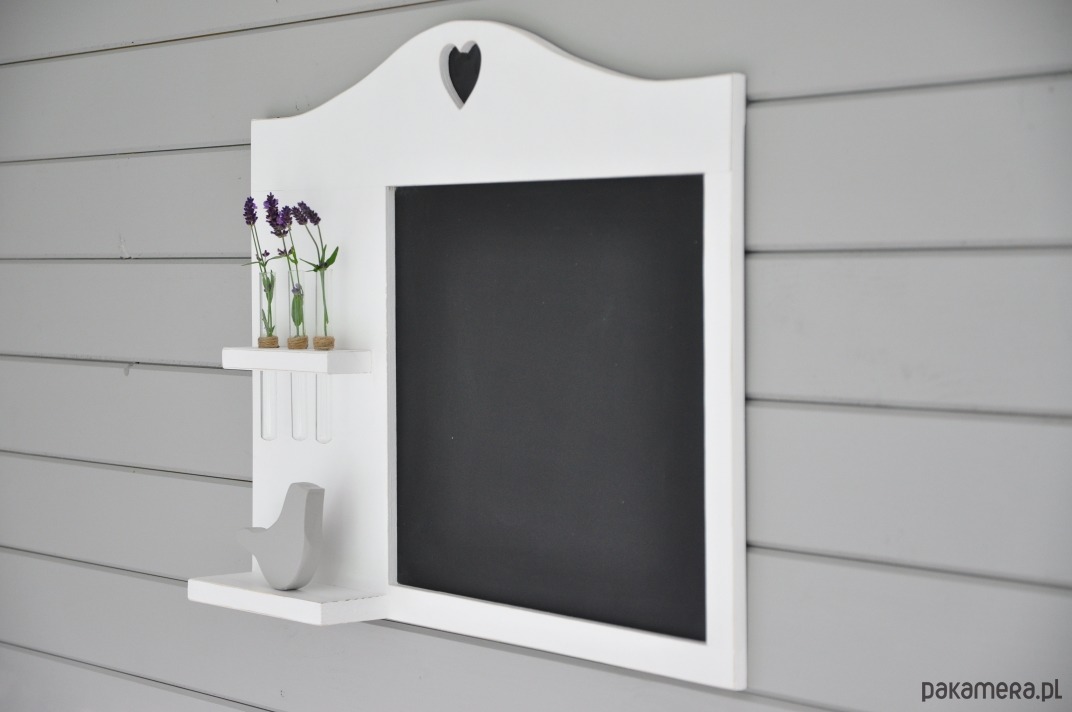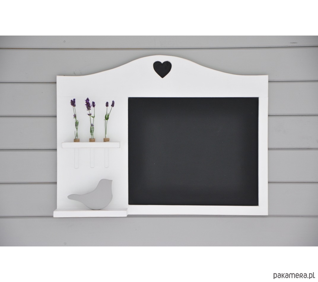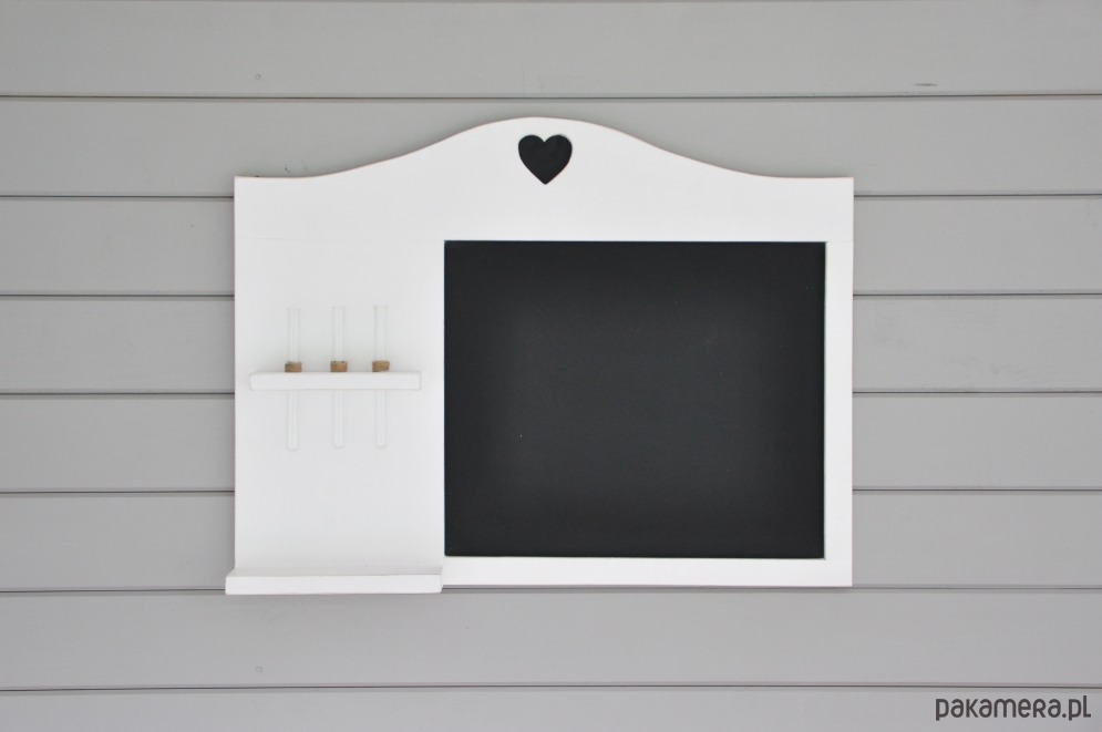 Półka została wykonana z drewna sosnowego i pomalowana na biało i przetarta na krawędziach.. Idealnie nadaje się do przedpokoju. Na górze tablicy wycięte jest serduszko. Wazoniki w zestawie. Wymiary: wys. 43 cm, szer. 70 cm, gł. półeczki 7 cm.