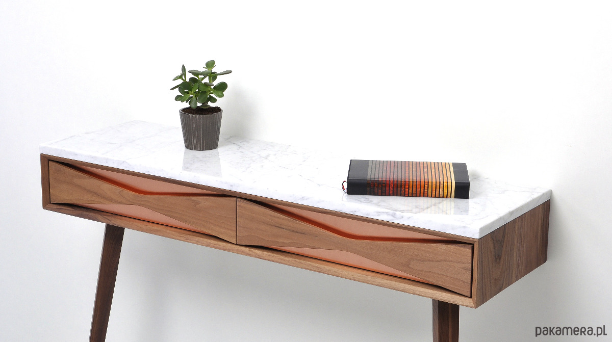 Konsola z dwiema szufladami w stylu mid century z miedzianymi frontami szuflad i marmurowym blatem.