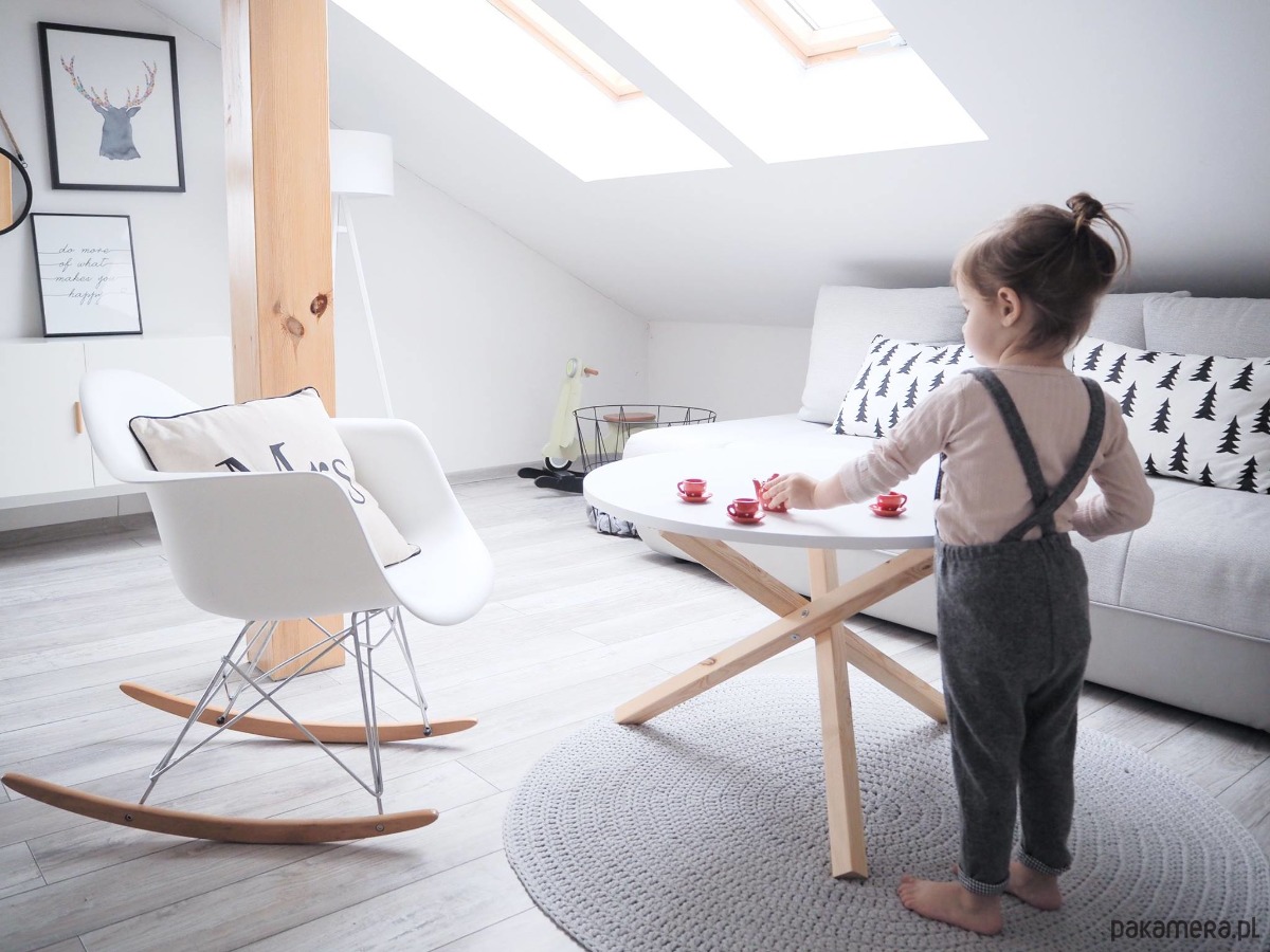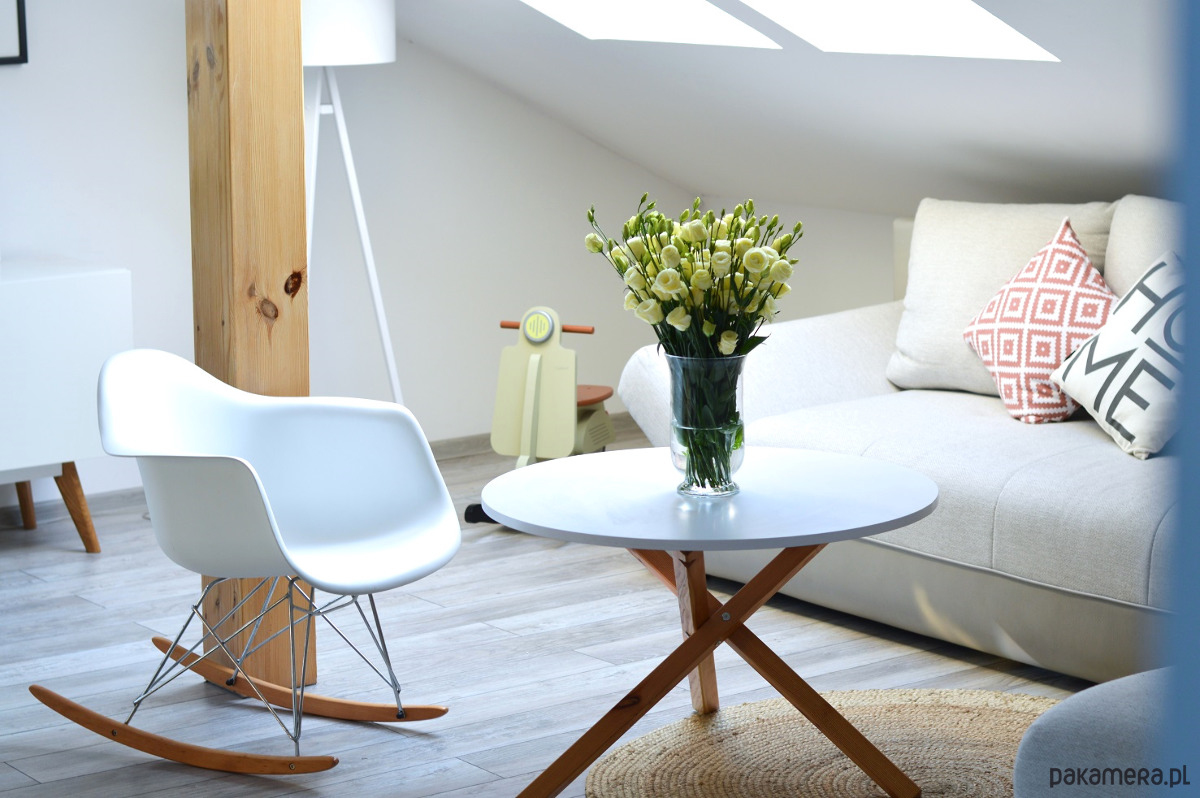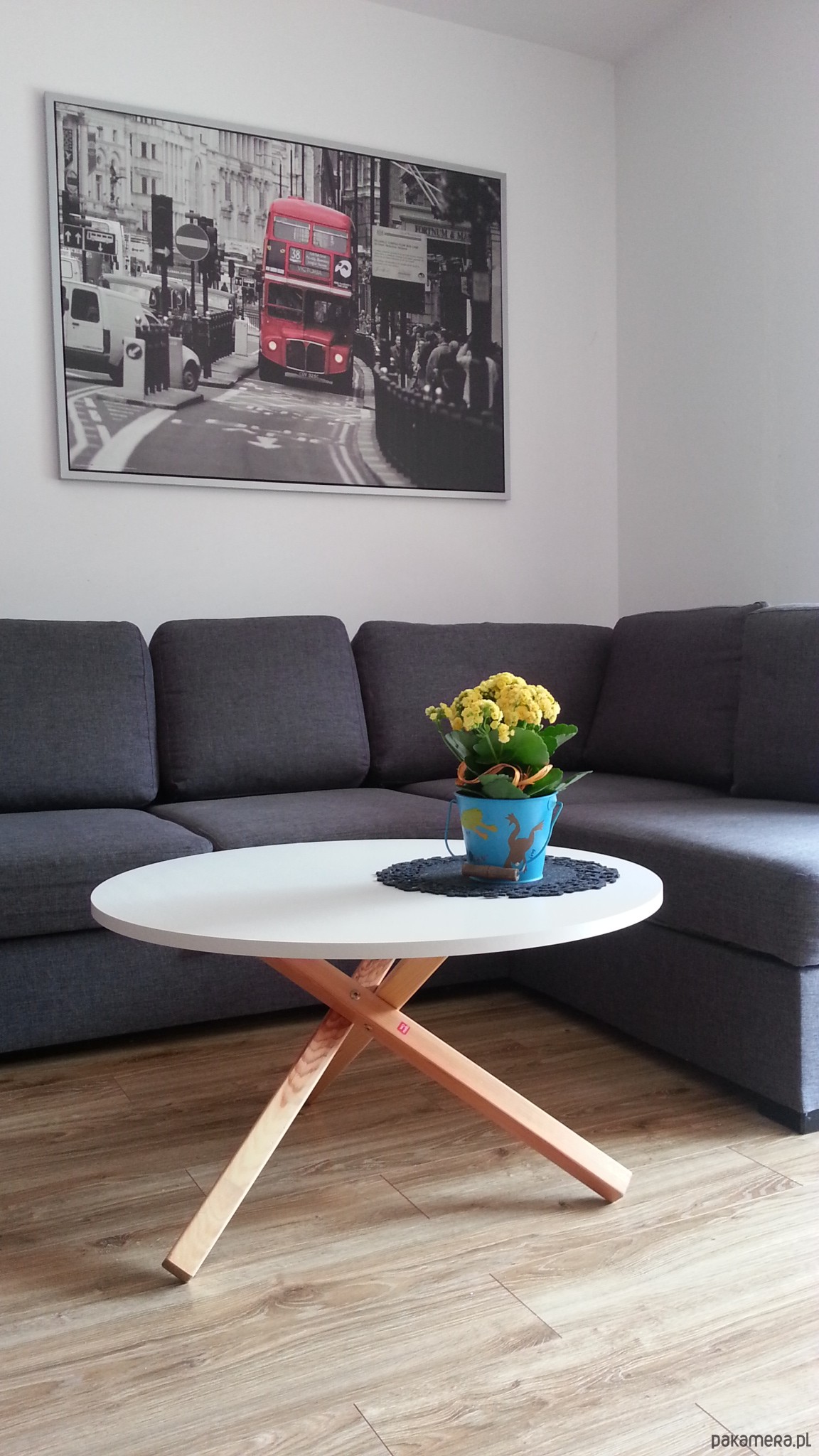 Funkcjonalny i o niepowtarzalnym kształcie stolik kawowy z okrągłym blatem w stylu skandynawskim. Wyższy i większy blat o średnicy 80cm względem swojego mniejszego brata (68cm)