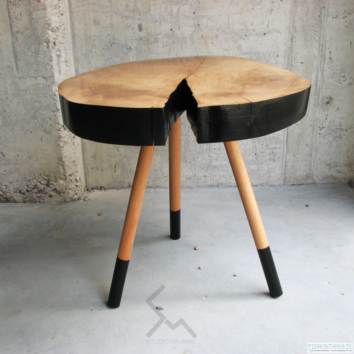 Stolik wykonany z plastra bukowego drzewa oraz bukowych nóżek. Czarne elementy pokryte farba tablicową. Całość zabezpieczona lakierem najwyższej twardości-ekologicznym, nie trującym, co daje gwarancję wodoodporności i braku zarysowań. Pęknięcie wzmocnione metalową płytką oraz śrubami. Można zamówić wyższy lub niższy. Może służyć jako stolik nocny, stolik na drobne rzeczy, na lampę, lub do salonu Stoliki są wykonywane z naturalnych plastrów drewnianych poszczególne dostawy różnią się nieznacznie średnicą, nie wszystkie posiadają też pęknięcia. Więc jeśli cenisz sobie piękno czystej natury i jesteś gotowy na niespodzianki kupuj od razu. Jeśli jednak spodobała ci się konkretna wersja lub chciałbyś zamówić coś specjalnie pod siebie napisz najpierw do nas i ustalmy wszystkie szczegóły. Z tyłu piękna filcowa metka Studio Minimal podbity wytrzymałymi podkładkami filcowymi Wykonujemy stolik na zamówienie o indywidualnych parametrach. Możlwiość wybrania koloru z listy dostępnych. Farby w innych kolorach nie są farbami tablicowymi a farbami ekologicznymi do drewna. Czarny kolor na zdjęciach jest kolorem czarnym (farba tablicowa)