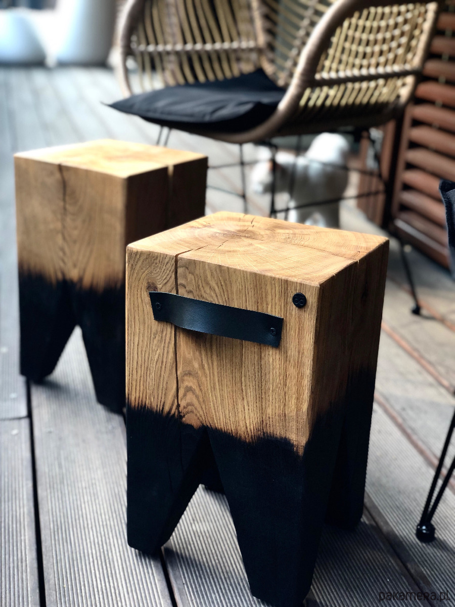 Stolik pieniek OszO opalony to pień geometrycznie wyciętymi nogami z litego drewna dębu.