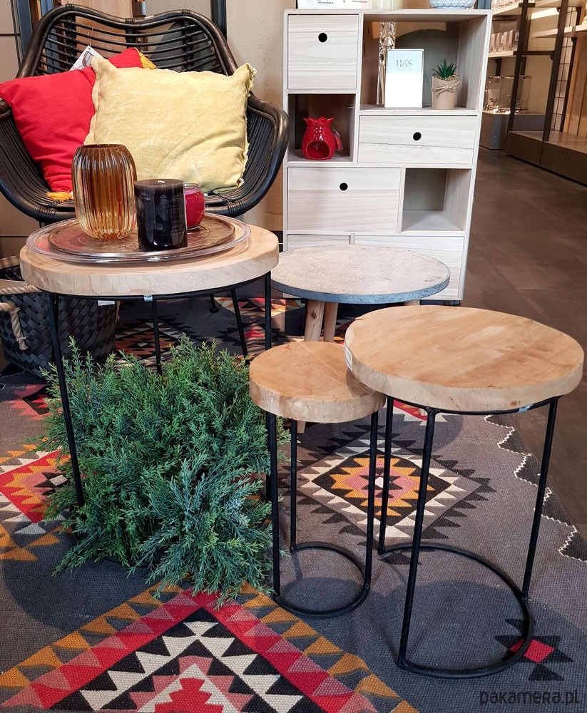 Komplet stolików na oryginalnie zaprojektowanej metalowej podstawie w kolorze czarnym. Blat wykonany został z drewna tekowego. Zestaw prezentuje się wyjątkowo elegancko, będzie wyróżniającym się elementem każdego wnętrza. Charakterystyczne niedoskonałości są naturalną cechą wykorzystanego materiału i stanowią o unikatowości produktu. Stoliki są wyjątkowo wytrzymałe oraz funkcjonalne, wyglądają niebanalnie i pasują do pomieszczeń o różnym przeznaczeniu.