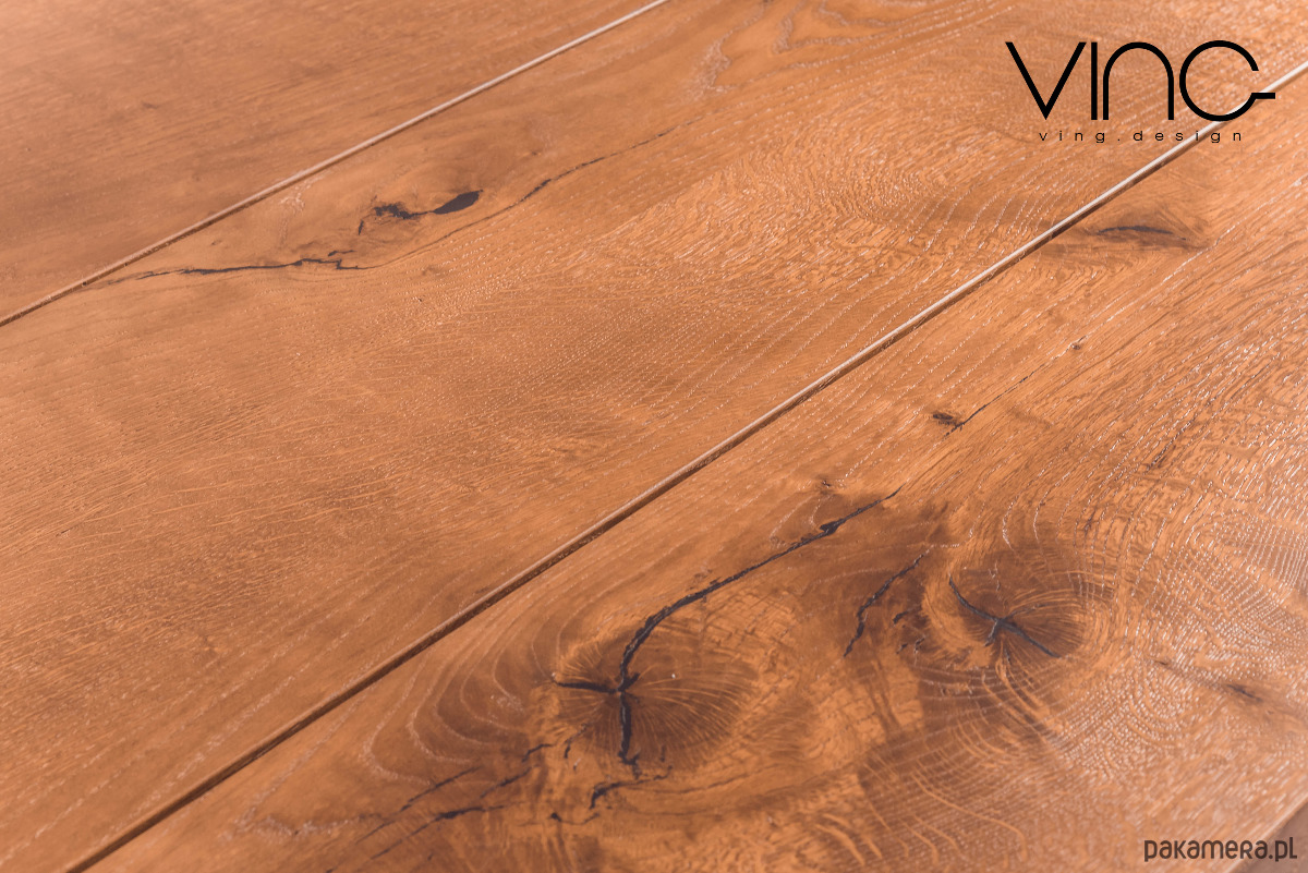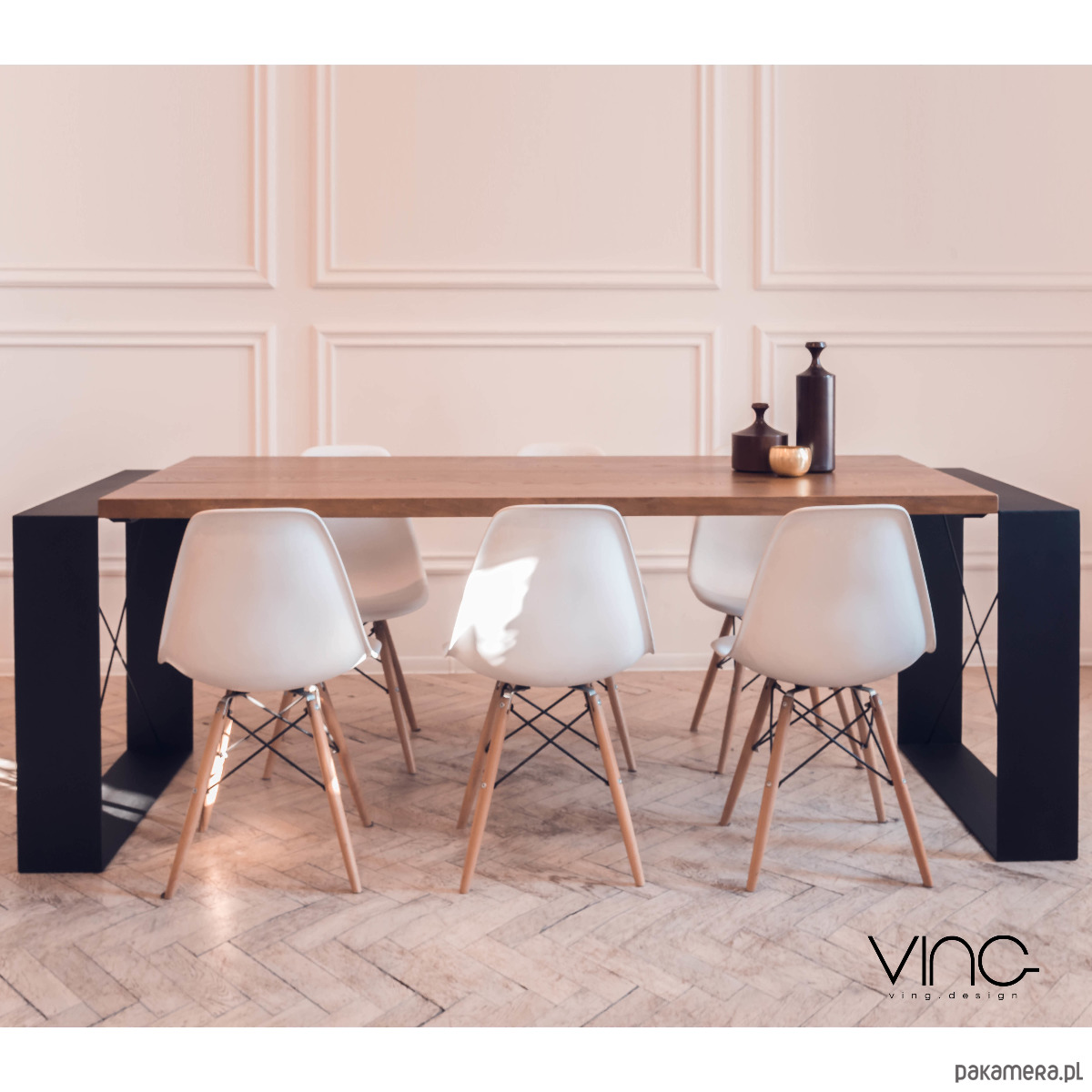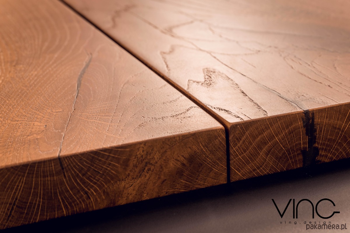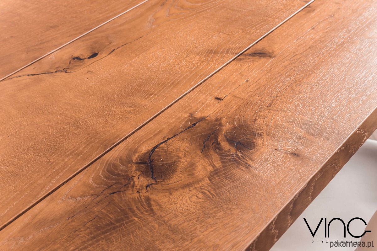 Lity dębowy stół. Jego blat został wykonany z bejcowanego na ciemny kolor drewna dębowego zabezpieczonego lakierem, nie olejem który po roku użytkowania wymaga renowacji.