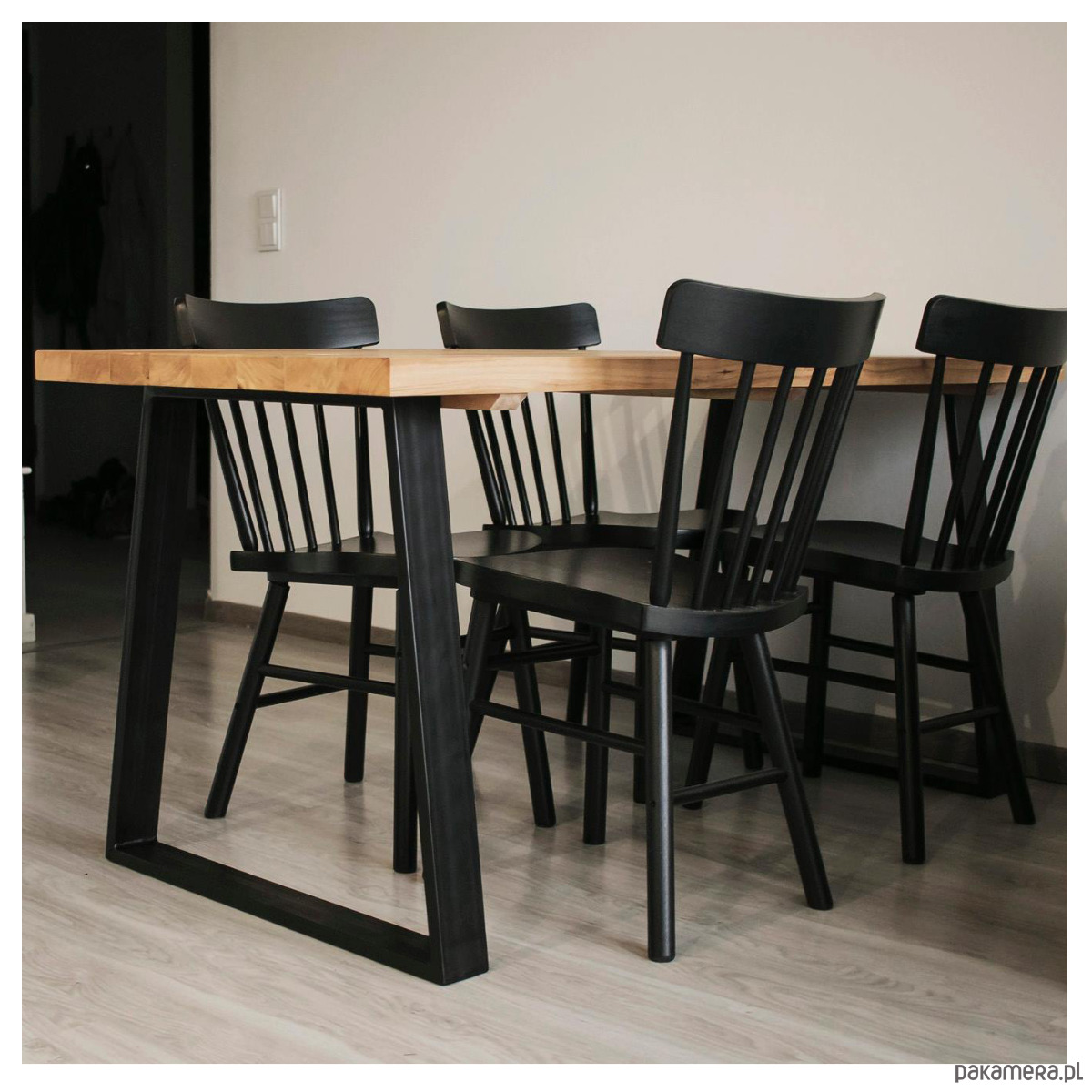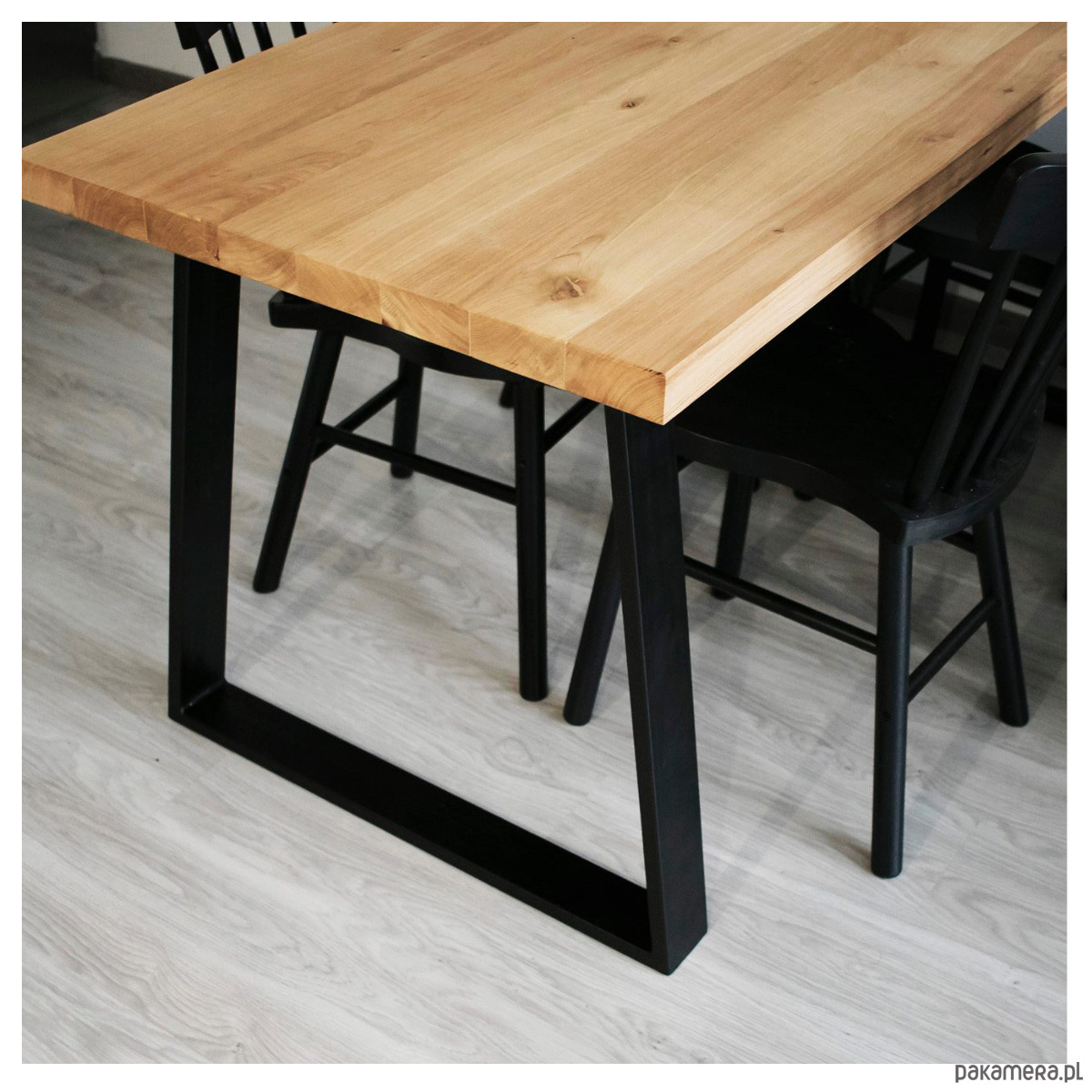 Dębowe drzewo oraz malowane proszkowo nogi.