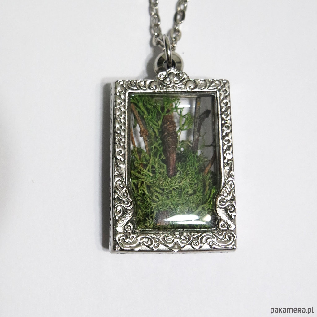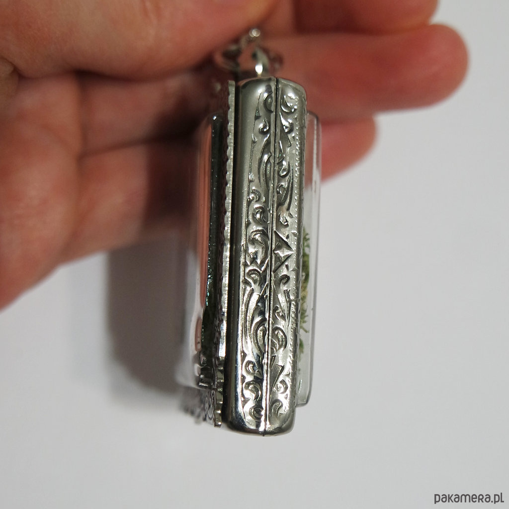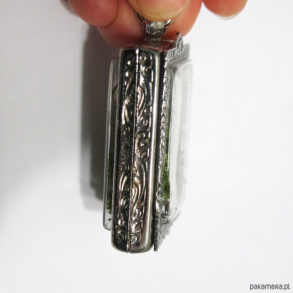 Kompozycja umieszczona jest w pięknie zdobionym medalionie wykonanym z metalu i tworzywa sztucznego o wymiarach ok. 3 x 4 cm.