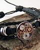 Uniseksowa bransoletka w etnicznym klimacie, łącząca rzemyki, koraliki, żywicę, metal oraz oryginalne części mechanizmu zegarka.