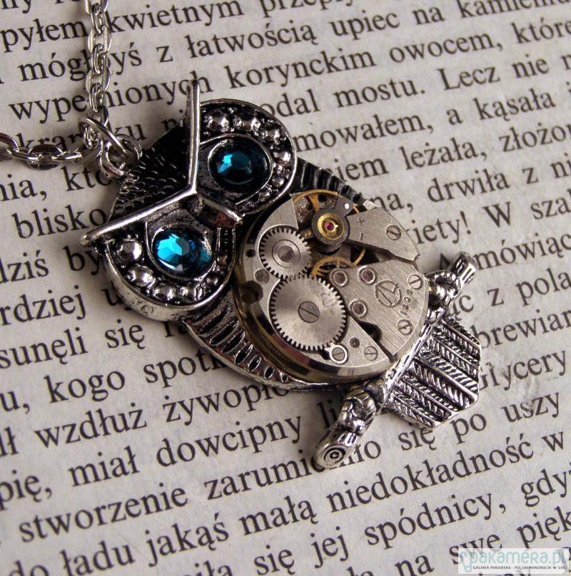 Metalowy naszyjnik w kształcie sowy, z kryształkami Swarovskiego i oryginalnym mechanizmem zegarkowym. Unikalny motyw łączy klasyczny kształt sowy z subtelnym industrialnym akcentem.