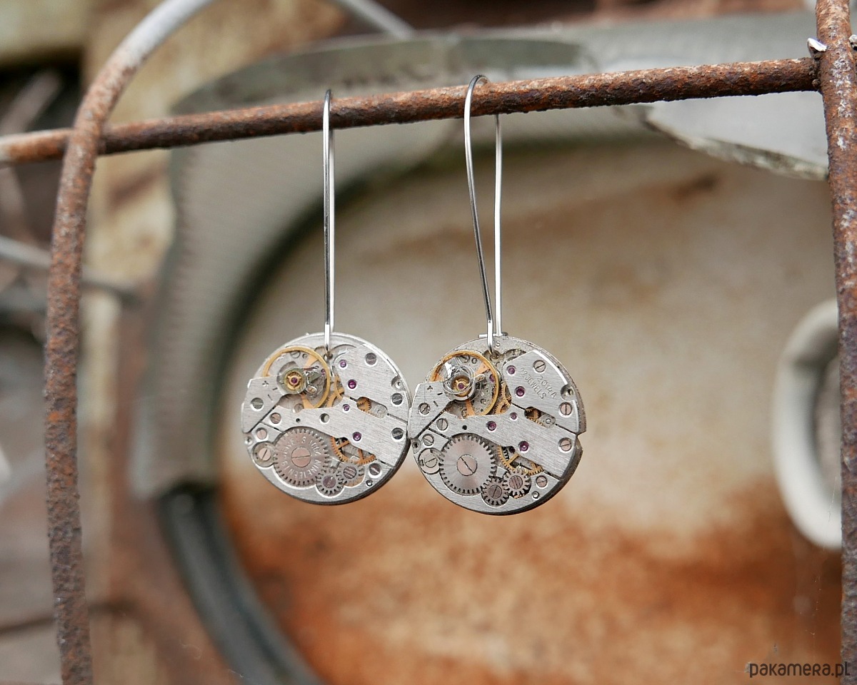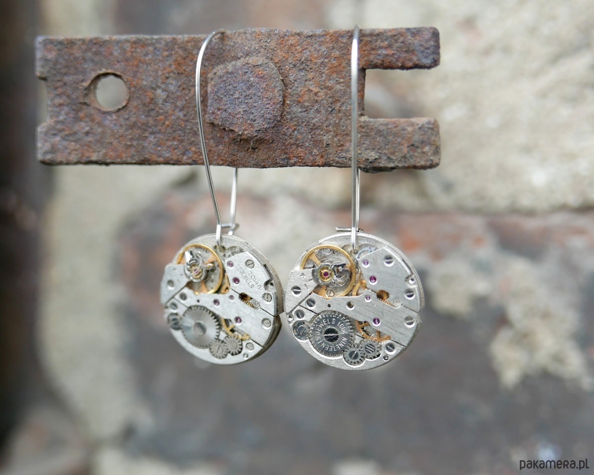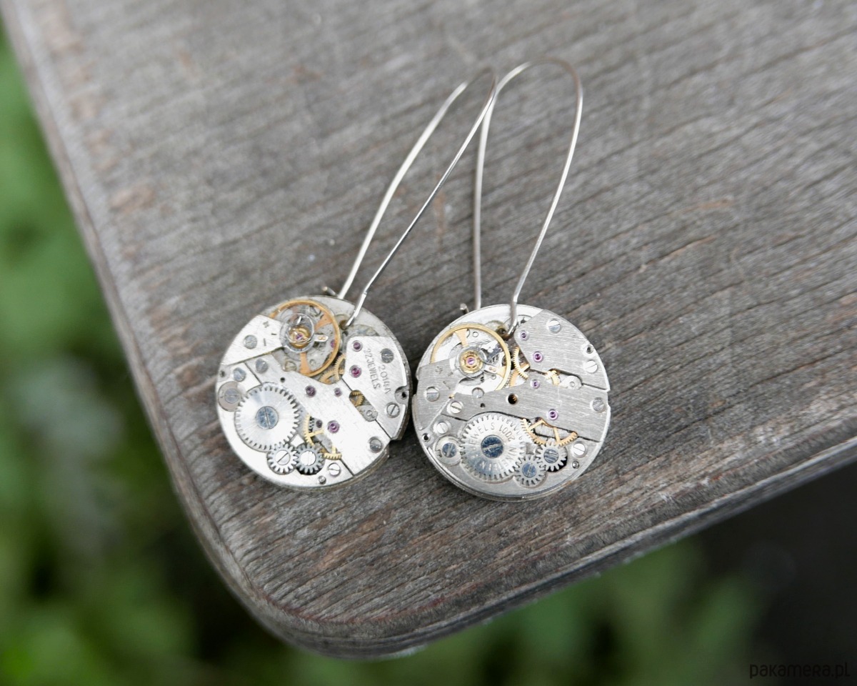 Industrialne kolczyki wykonane z oryginalnych mechanizmów zegarkowych. Idealny wybór dla osób szukających unikalnych, artystycznych dodatków.