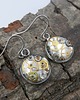Subtelne kolczyki wykonane z oksydowanego metalu, ozdobione elementami mechanizmów zegarka zatopionymi w żywicy, oraz opalizującą szarą emalią. Połączenie industrialnego charakteru metalu z subtelnym połyskiem emalii nadaje biżuterii unikatowy, efektowny charakter.