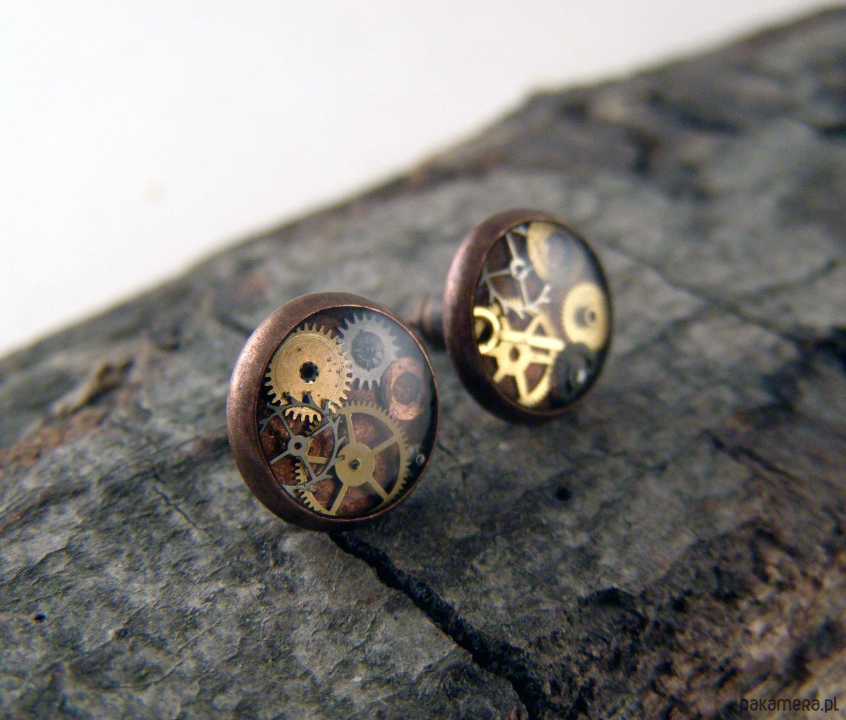 Kolczyki wykonane z miedzi, ozdobione oryginalnymi częściami mechanicznego zegarka zatopionymi w żywicy. Subtelne zębatki ukryte w środku odbijają światło, przyciągając wzrok i nadając biżuterii unikatowy charakter.
