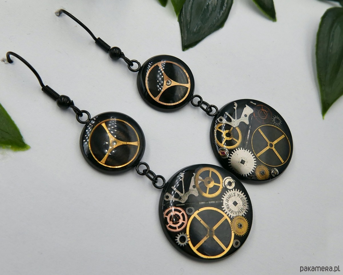 Stylowe kolczyki wykonane z czarnego metalu, ozdobione żywicą i detalami mechanizmu zegarka. Idealne dla osób szukających wyjątkowych akcesoriów z odrobiną tajemniczości.