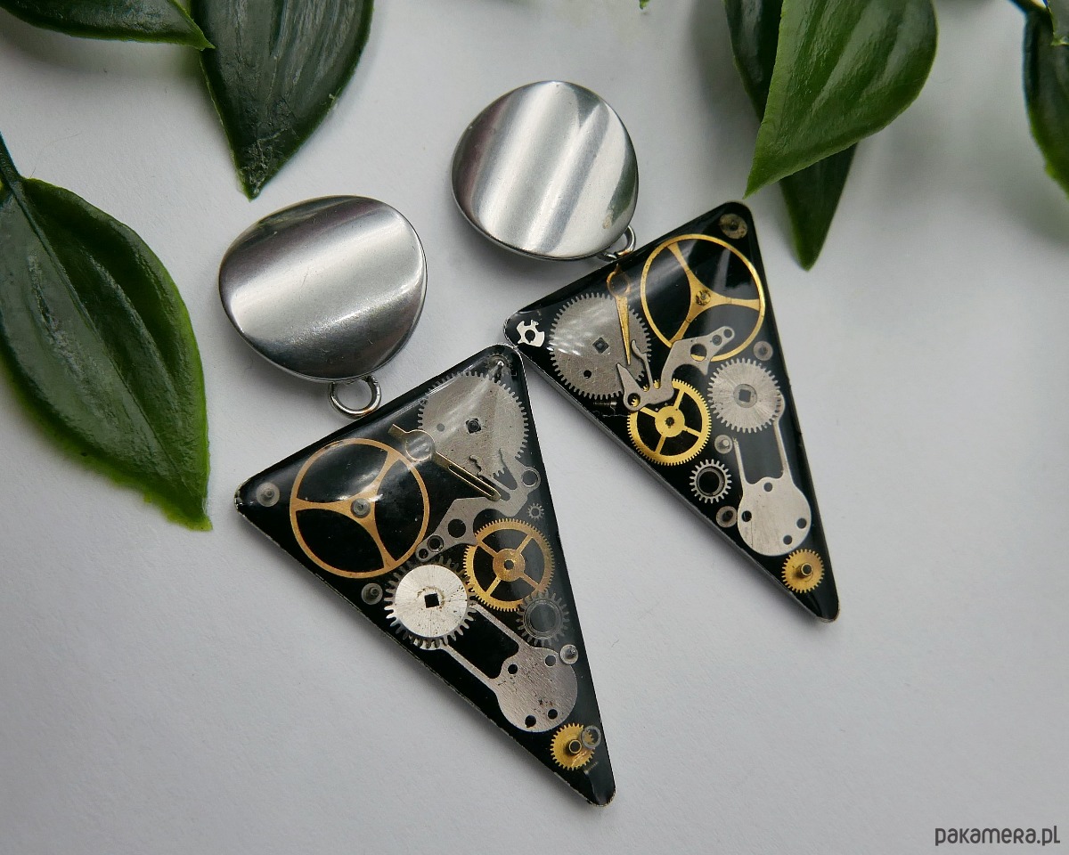 Kolczyki na sztyftach, wykonane ze stali, zdobione elementami zegarka zatopionymi w żywicy. Połączenie metalicznej bazy z industrialnymi detalami nadaje biżuterii niepowtarzalny charakter, idealny dla osób ceniących oryginalny, steampunkowy styl.