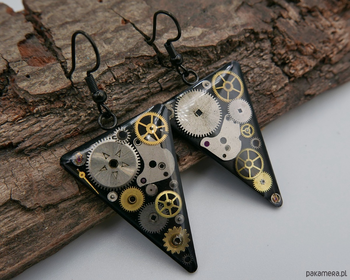 Oryginalne kolczyki wykonane ze stali, zdobione elementami mechanicznych zegarków zatopionymi w żywicy. Połączenie geometrycznej formy z industrialnymi detalami sprawia, że biżuteria nabiera niepowtarzalnego charakteru i wyróżnia się w każdej stylizacji.