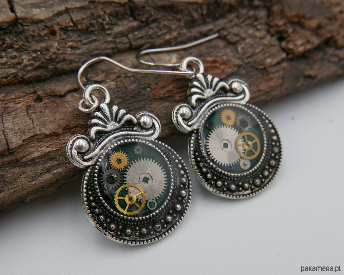 Kolczyki wykonane z metalu, żywicy i ciemnozielonej emalii, ozdobione elementami zegarka.