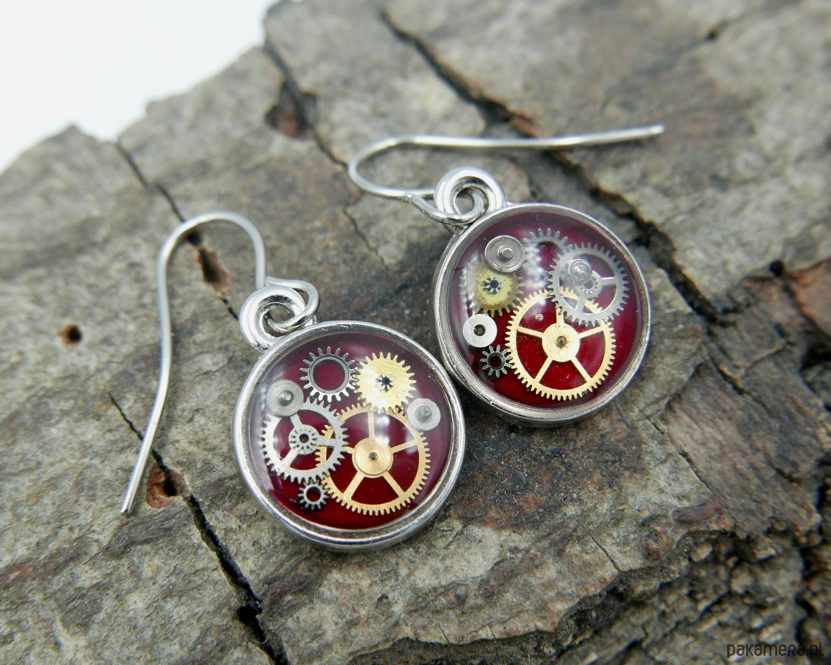 Delikatne kolczyki, wykonane z metalu, ozdobione elementami zegarka zatopionymi w żywicy oraz ciemnoczerwoną emalią. Subtelny, industrialny design nadaje biżuterii unikatowy charakter.