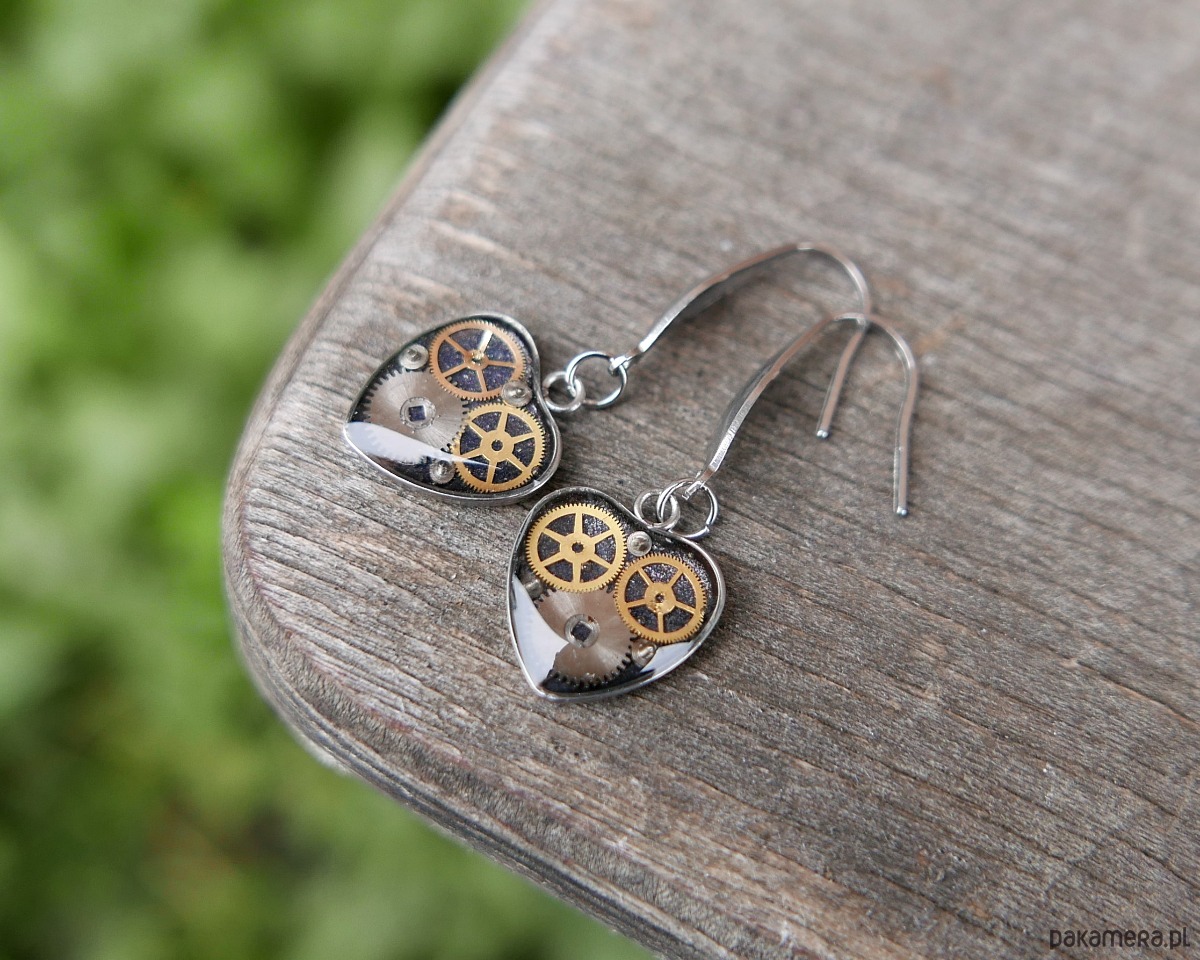 Kolczyki z metalu, z miniaturowymi częściami zegarka pod żywicą epoksydową.