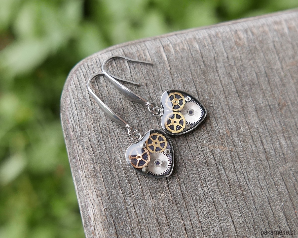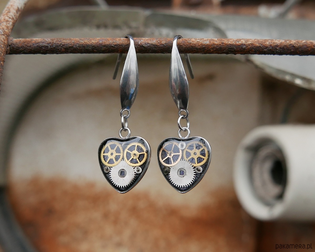 Kolczyki z metalu, z miniaturowymi częściami zegarka pod żywicą epoksydową.