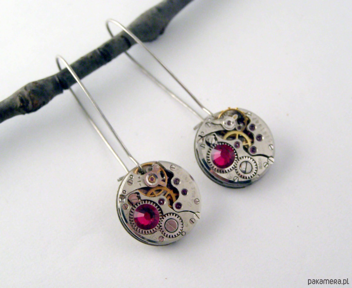 Industrialne kolczyki wykonane z oryginalnych mechanizmów zegarkowych i kryształków Swarovskiego. Idealny wybór dla osób szukających unikalnych, artystycznych dodatków.