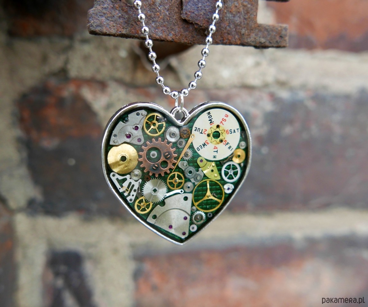 Unikalny i stylowy metalowy naszyjnik z częściami zegarka zatopionymi w żywicy epoksydowej.