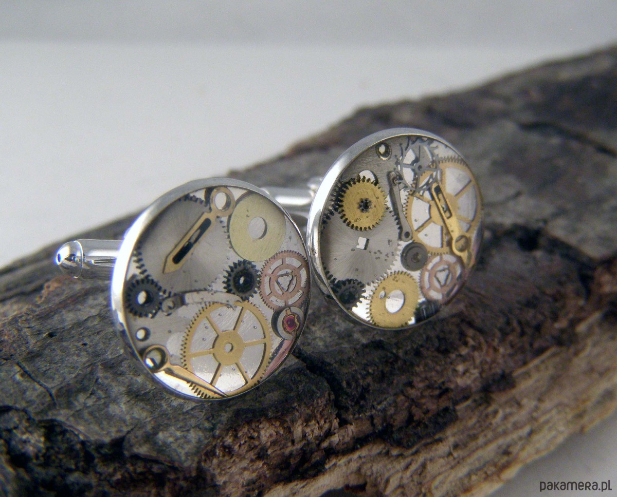 Niezwykłe spinki do mankietów w industrialnej estetyce. Każdy egzemplarz powstaje z oryginalnych części mechanizmu zegarka, które nadają mu niepowtarzalny charakter. Elementy te zostały zatopione w żywicy epoksydowej, dzięki czemu tworzą efekt trójwymiarowej głębi.