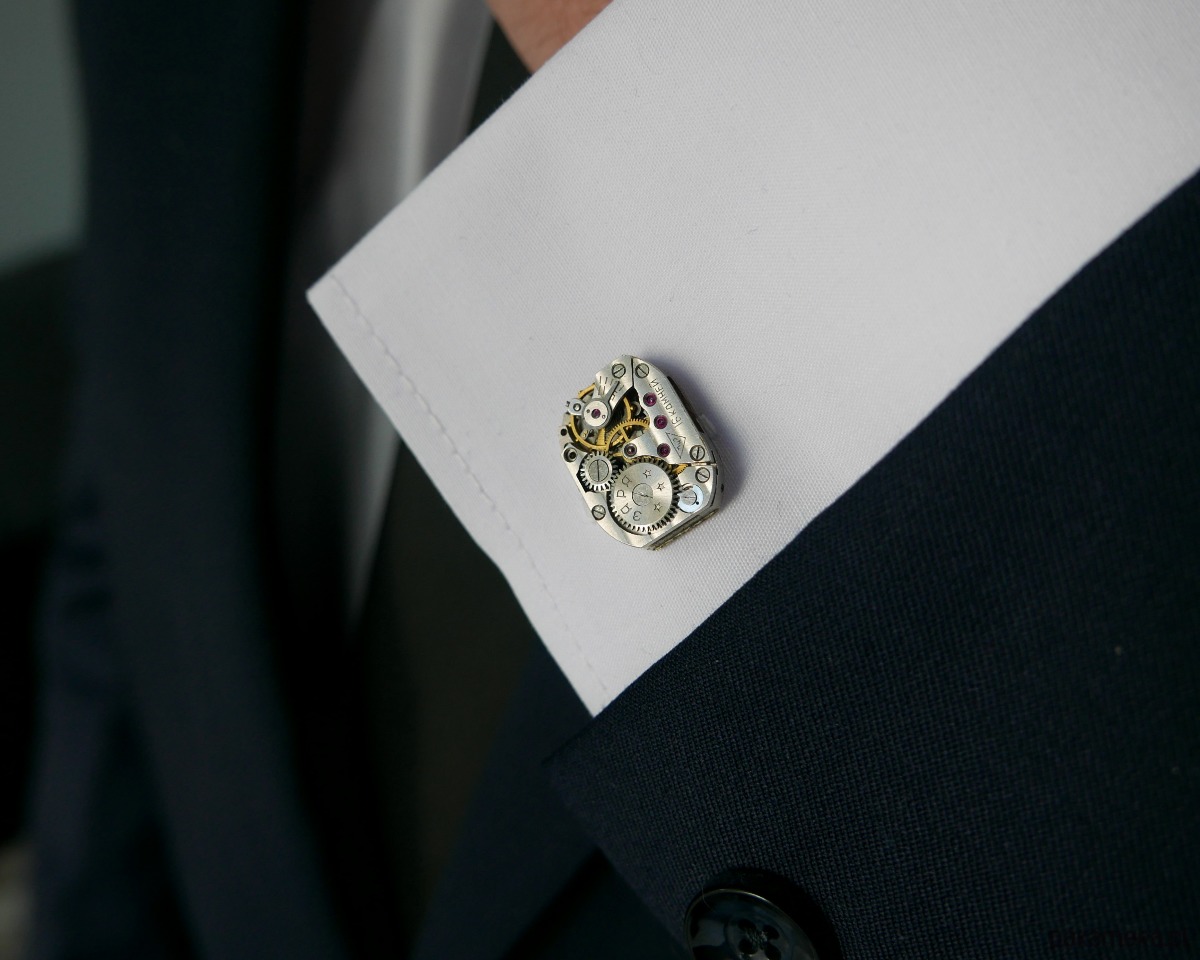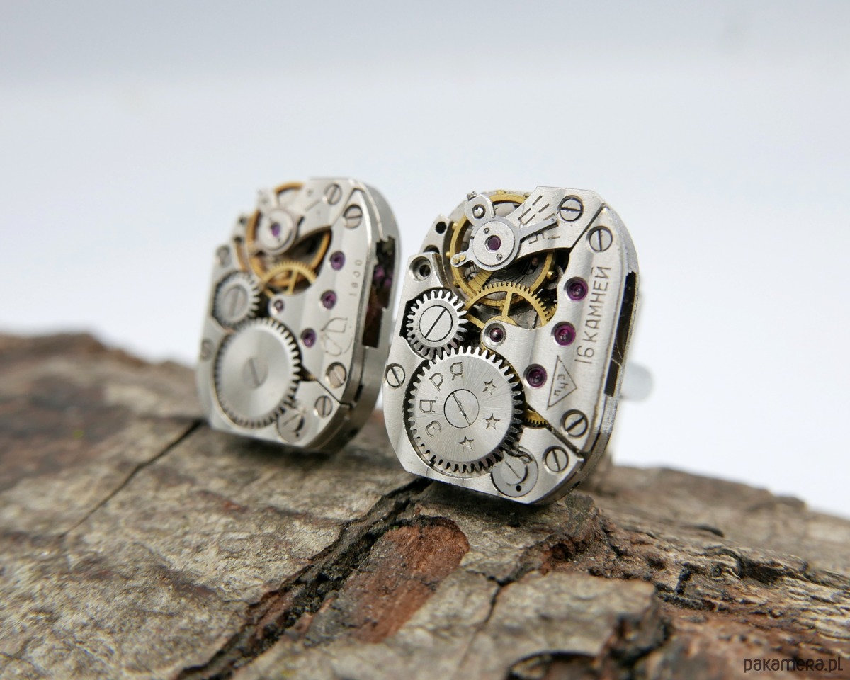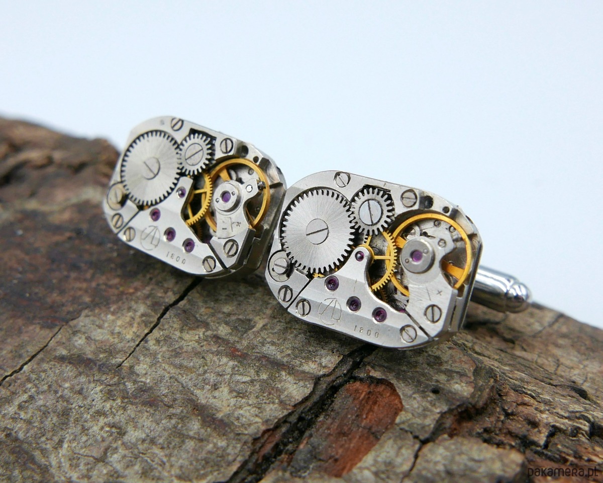 Eleganckie spinki do mankietów wykonane z oryginalnych mechanizmów zegarkowych w kolorze srebrnym. Idealny wybór dla osób szukających unikalnych, artystycznych dodatków.