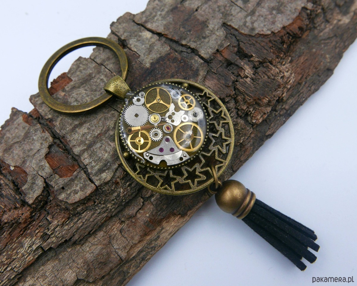 Unikalny brelok łączący mosiądz, żywicę i detale oryginalnego mechanizmu zegarka. Świetnie sprawdzi się jako ozdoba kluczy, torby czy plecaka.