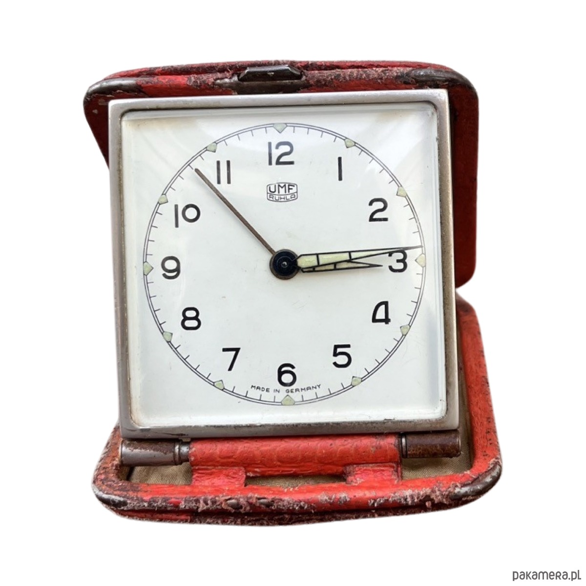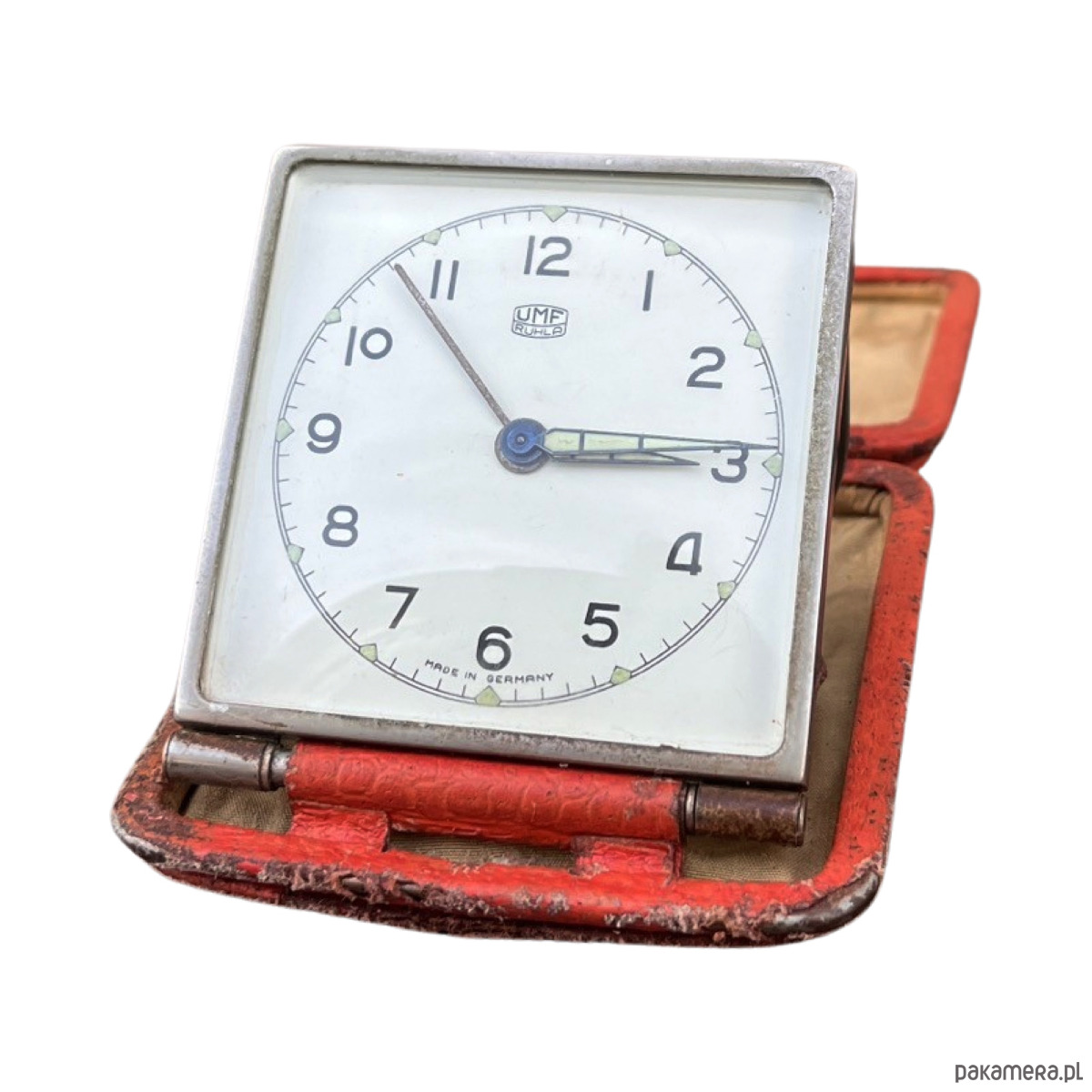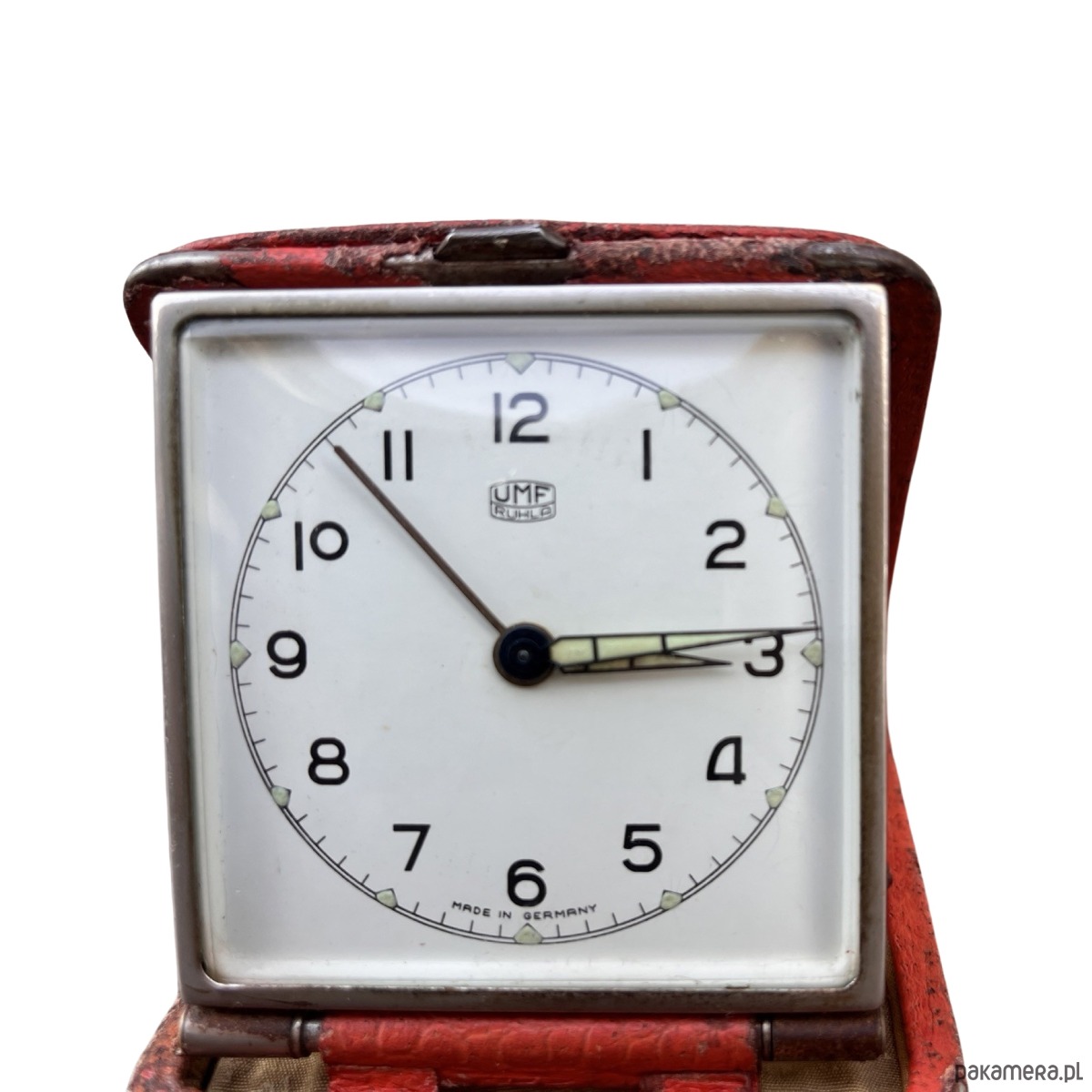Zegarek/budzik wyprodukowano we wschodnioniemieckiej firmie UMF RUHLA w połowie XX wieku.Tarcza budzika w kolorze białym, na niej czarne cyfry godzin oraz w takim samym kolorze fosforyzowane wskazówki o bardzo ładnym kształcie. Budzik z mechanizmem mosiężnymi. Budzik jest niewielkich rozmiarów, przez co był wygodny w użyciu, a obecnie będzie stanowił doskonały eksponat, przypominający minione czasy. Dzięki kasetce idealnie nadaje się do używania w podróży. Budzik na chodzie, wszystkie elementy i mechanizmy są sprawne. Czerwone, skórzane etui budzika w dobrym stanie, wyraźne ślady używania, patyna na okuciu.