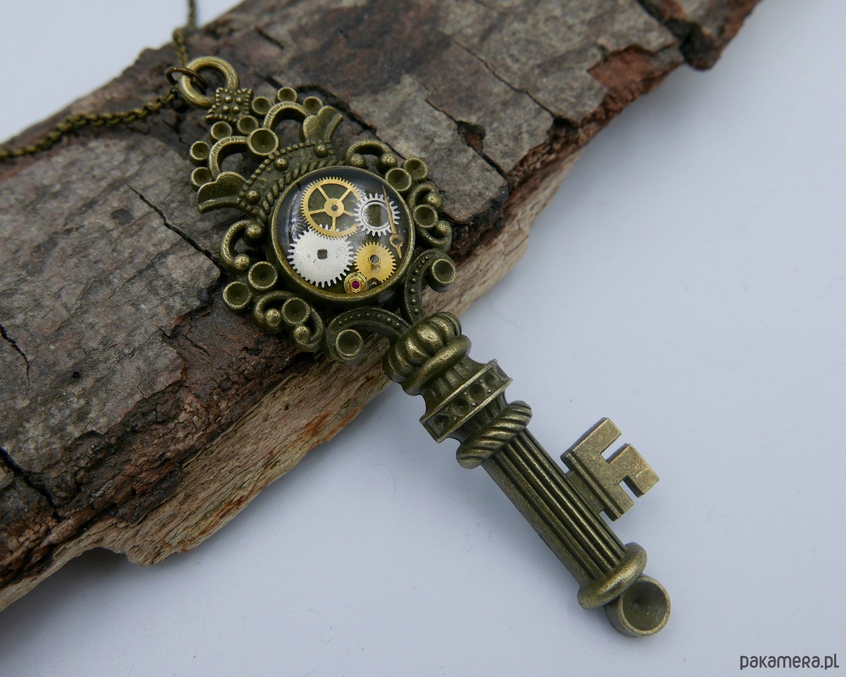 Naszyjnik steampunk – klucz z elementami mechanicznego zegarka zatopionymi w żywicy epoksydowej. Mosiężny naszyjnik kryje w sobie autentyczne części zegarka, które nadają mu industrialny, retro-futurystyczny charakter.