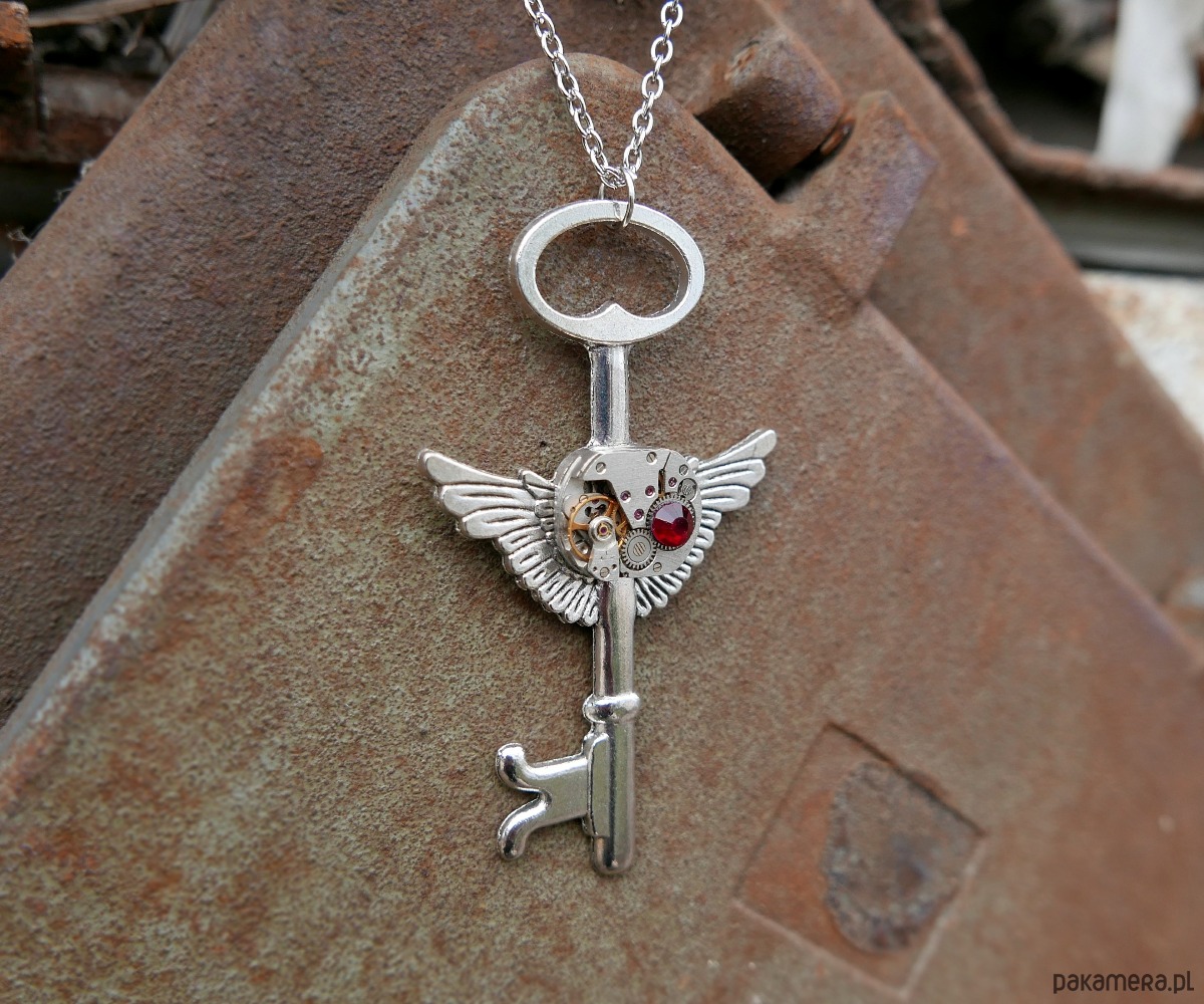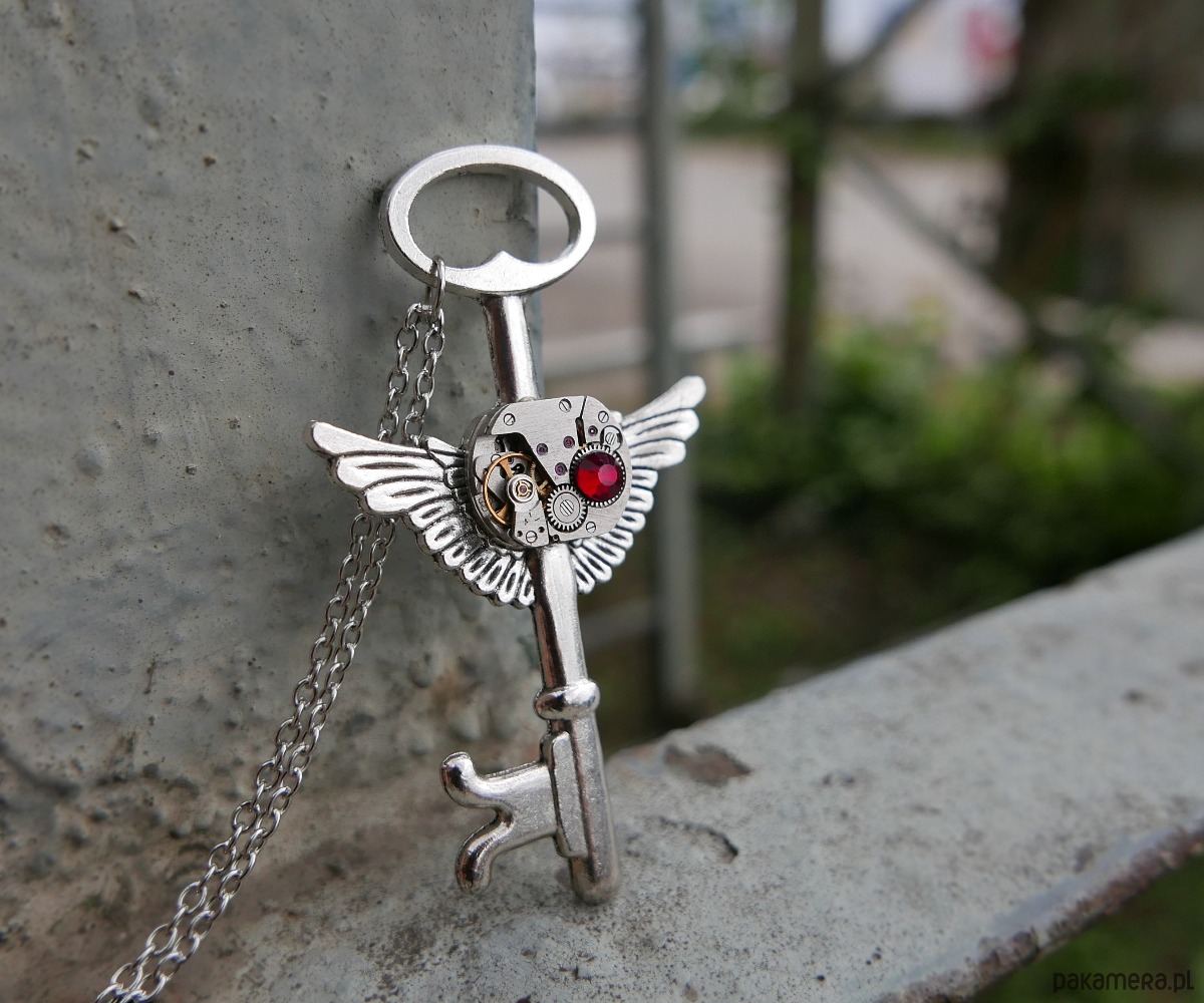 Naszyjnik steampunk – klucz z mechanizmem i kryształkiem Swarovskiego. Metalowy naszyjnik kryje w sobie autentyczne części zegarka, które nadają mu industrialny, retro-futurystyczny charakter.