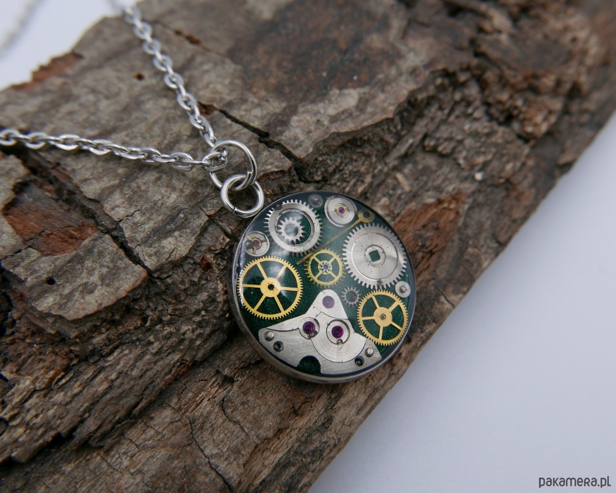 Naszyjnik łączący klasyczną formę i steampunkowego ducha. Metalowa oprawa, z zatopionymi w żywicy zegarkowymi różnościami.