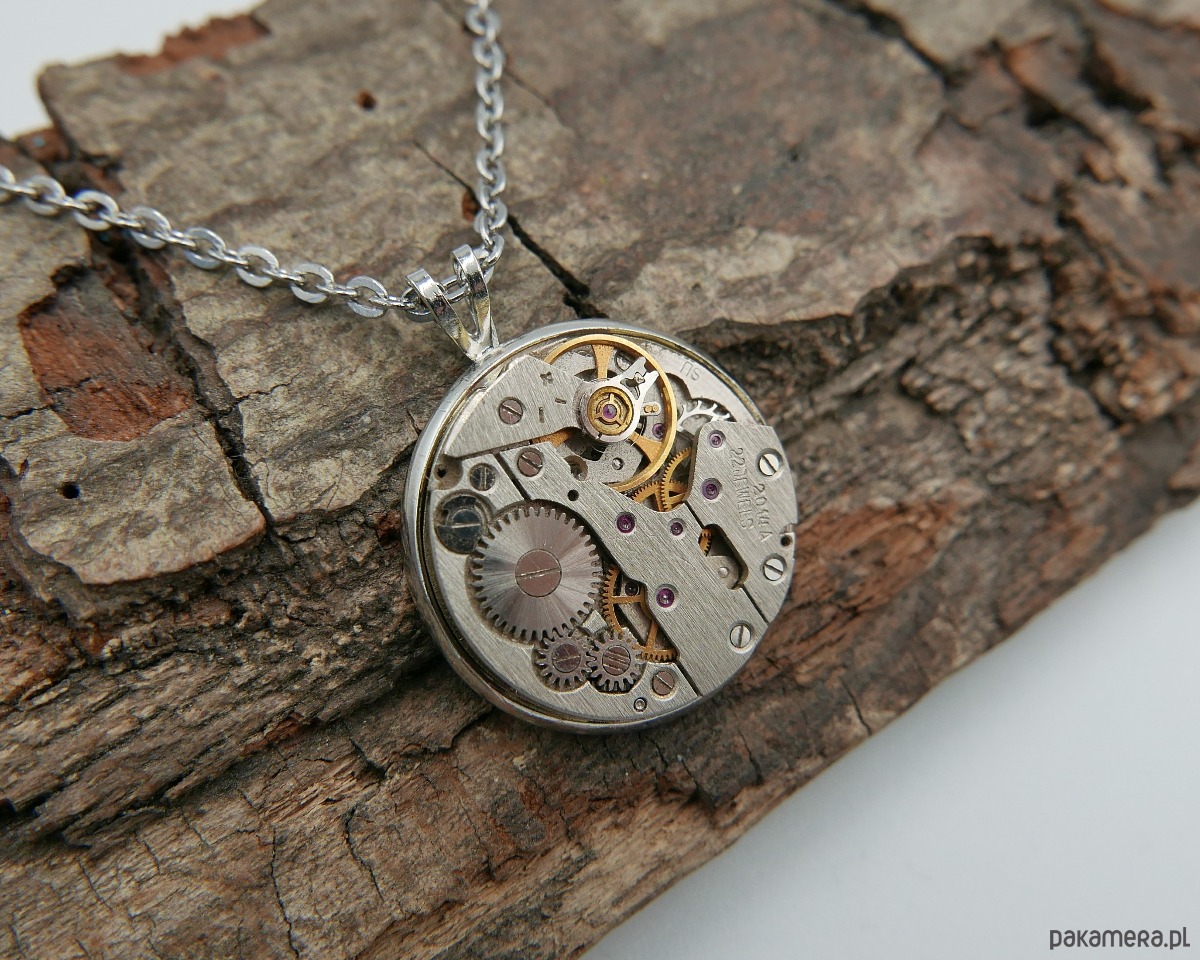 Delikatny naszyjnik wykonany z oryginalnego mechanizmu zegarka. Subtelna forma w połączeniu z industrialnym charakterem mechanizmu nadaje biżuterii unikatowy i elegancki styl.