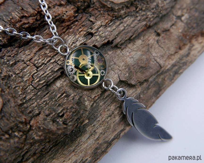 Filigranowy naszyjnik ze stali chirurgicznej z zawieszką z żywicy, w której zatopiono drobne elementy zegarka, oraz stalowe pióro.