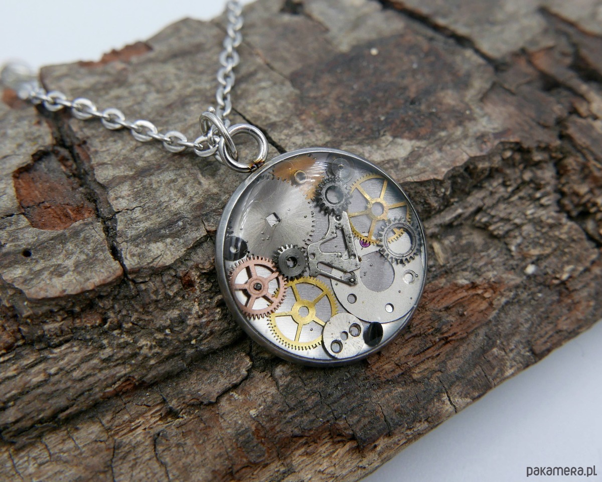 Filigranowy naszyjnik z metalu, żywicy i części zegarka. Średnica zawieszki 2 cm. Długość łańcuszka ok 60 cm.
