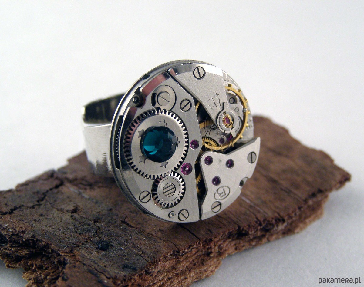 Unikalny pierścionek stworzony z oryginalnego mechanizmu zegarkowego, ozdobiony kryształkiem Swarovskiego. Połączenie precyzyjnej techniki z eleganckim blaskiem tworzy wyjątkowy dodatek, który przyciąga wzrok.