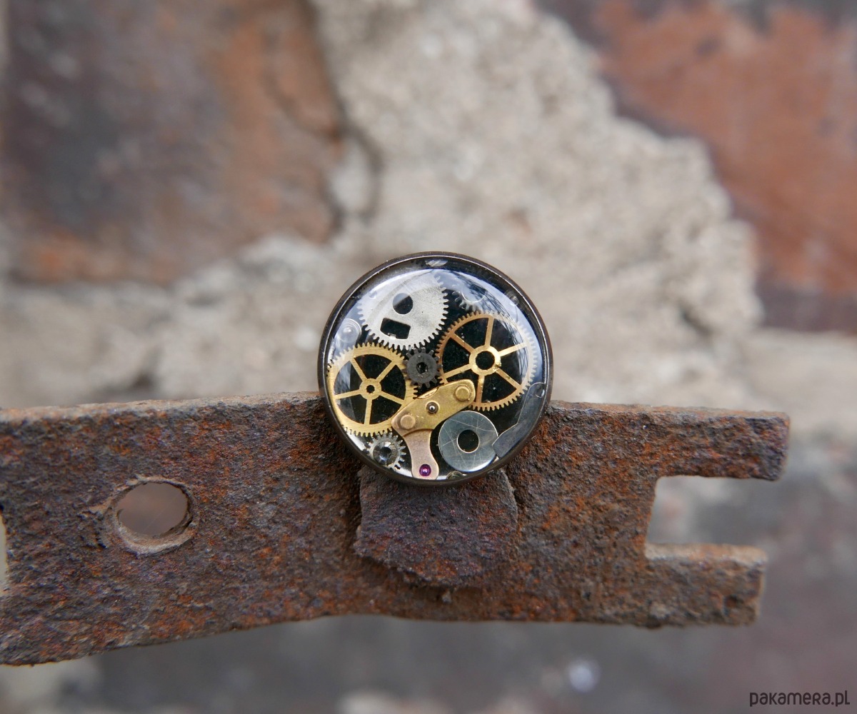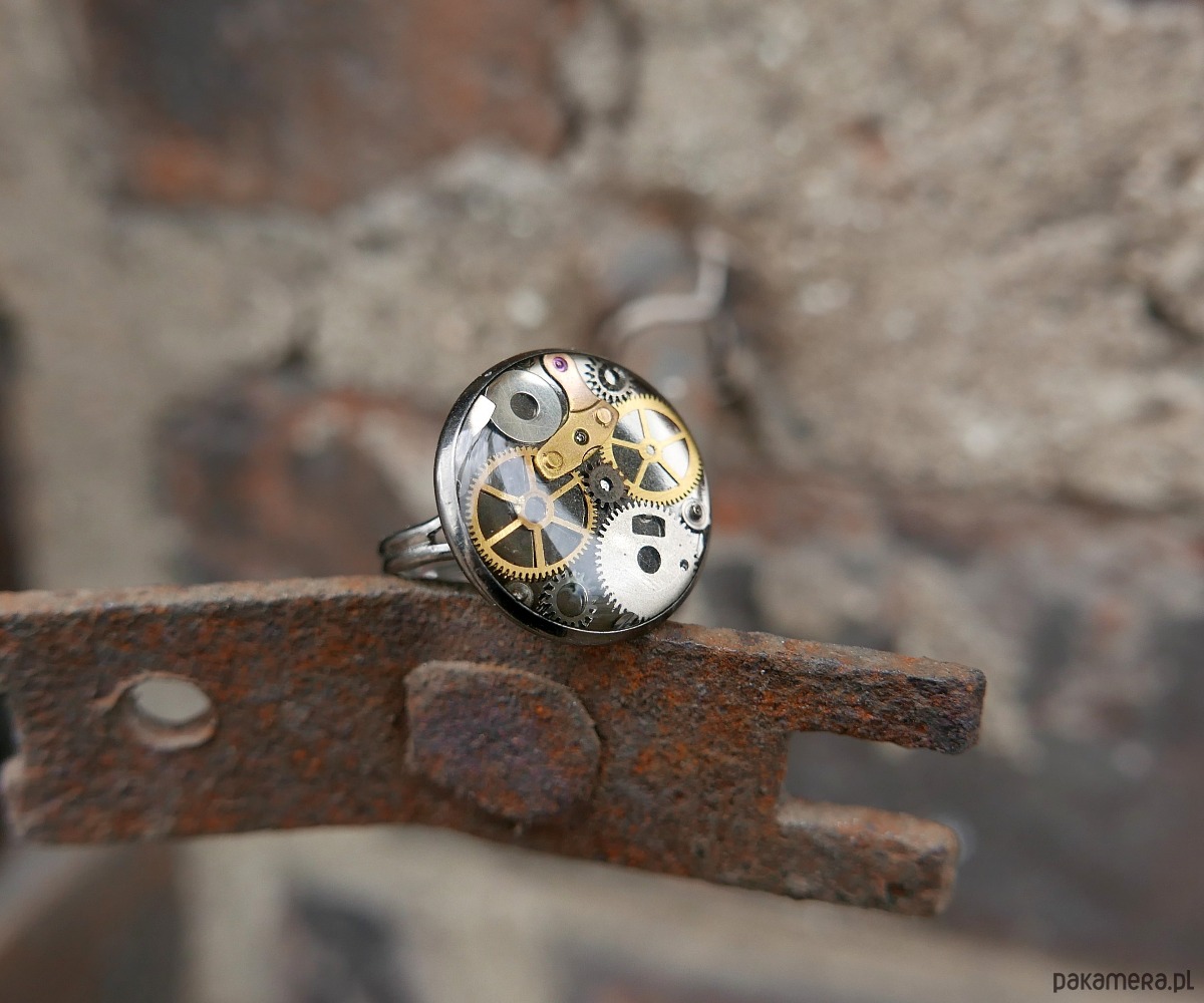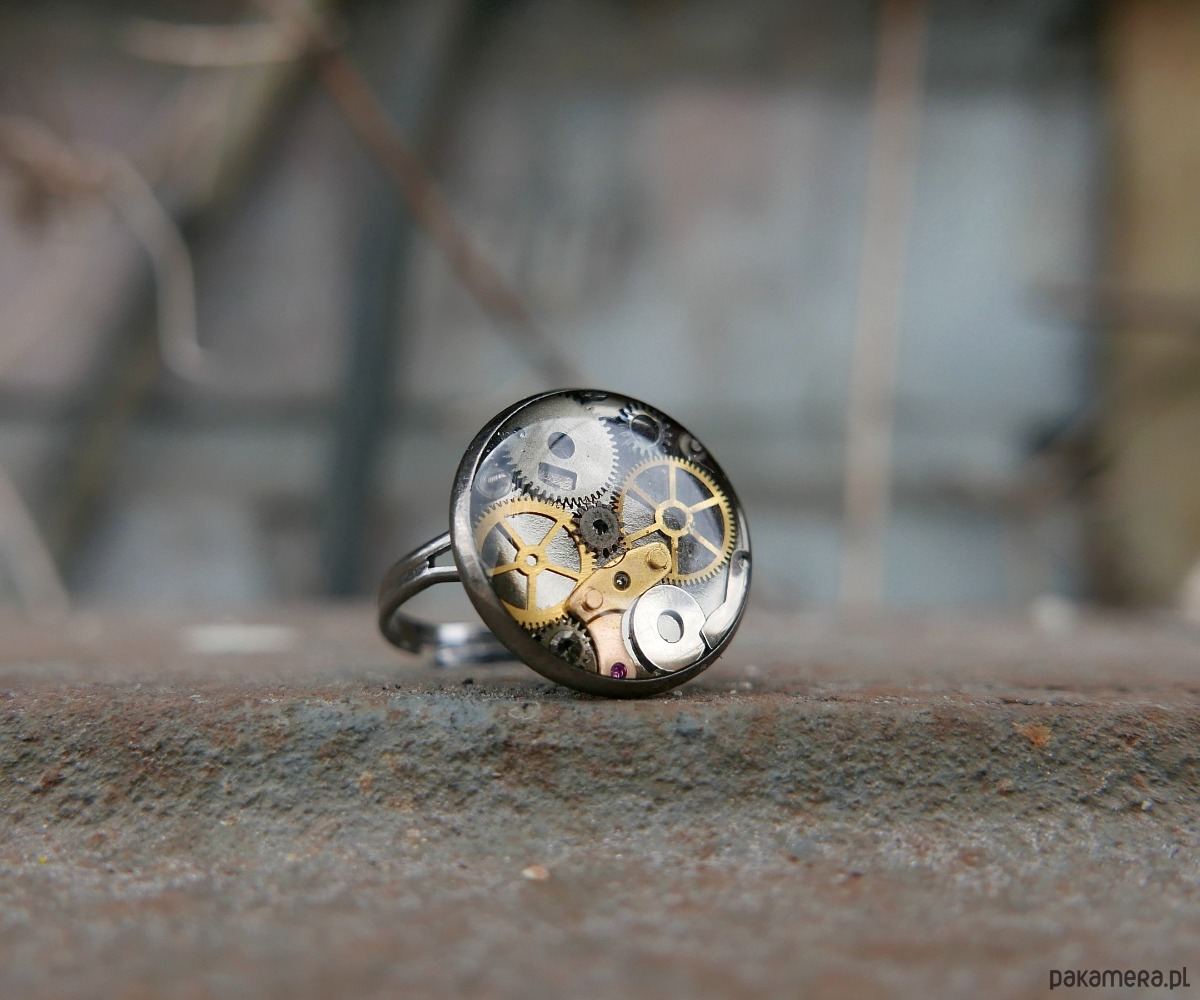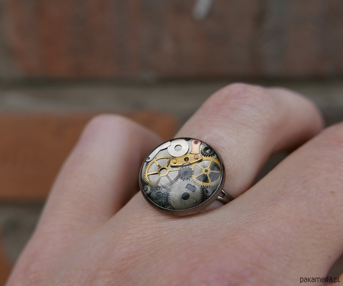 Delikatny pierścionek wykonany ze stali nierdzewnej, ozdobiony elementami mechanizmu zegarka zatopionymi w żywicy. Iindustrialny akcent, który doskonale wpisuje się zarówno w nowoczesny, jak i romantyczny styl.