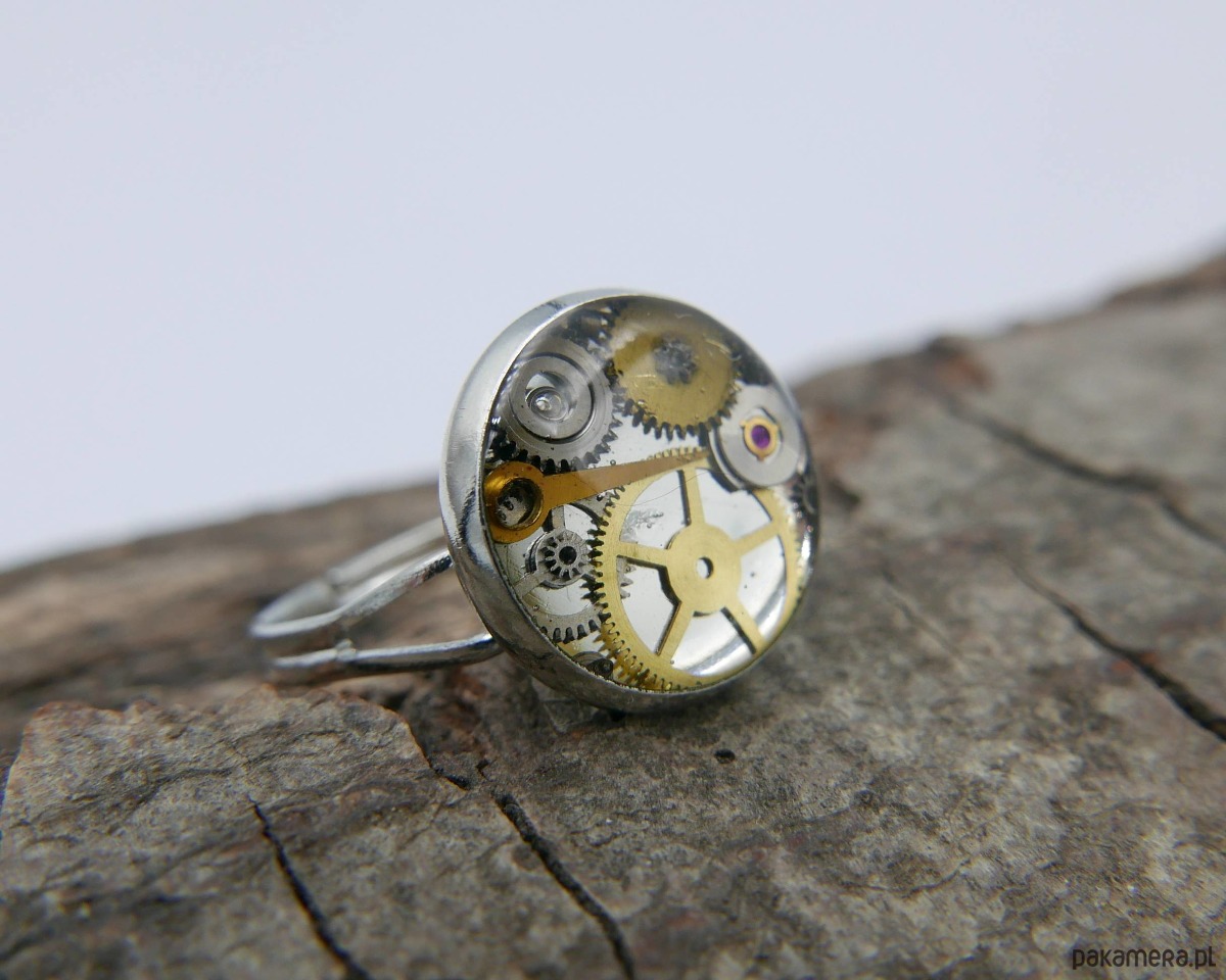 Delikatny pierścionek wykonany ze stali nierdzewnej, ozdobiony elementami mechanizmu zegarka zatopionymi w żywicy. Iindustrialny akcent, który doskonale wpisuje się zarówno w nowoczesny, jak i romantyczny styl.