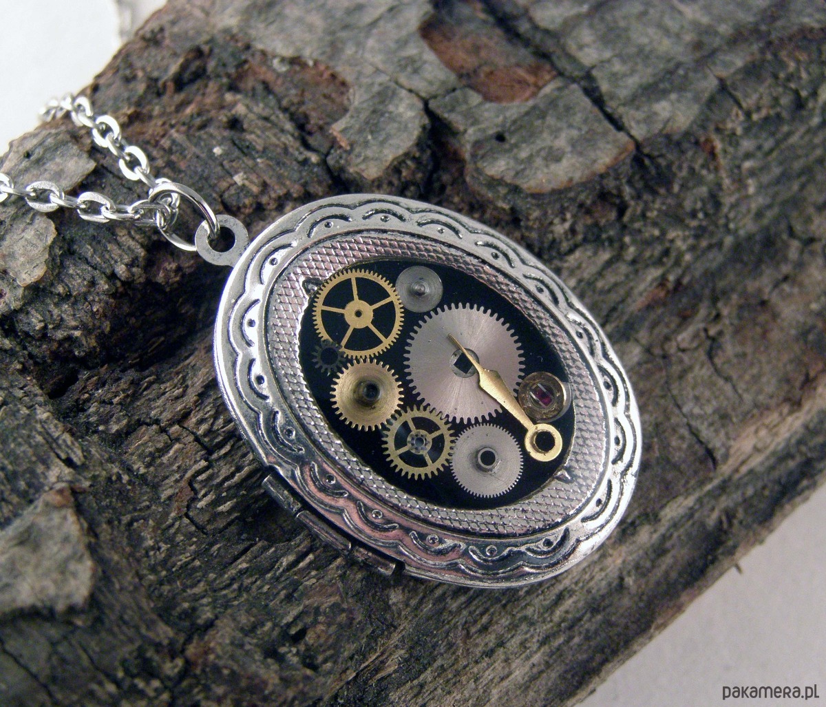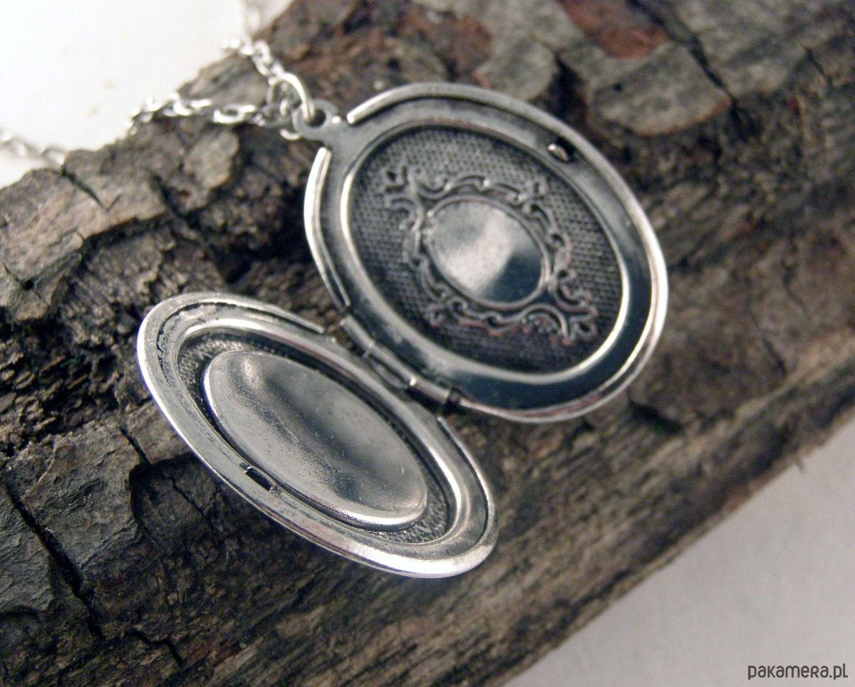 Delikatny naszyjnik z metalu. W środku miejsce na 2 zdjęcia. Wysokość zawieszki - 3 cm, szerokość - 2,2 cm. Długość łańcuszka - ok 60 cm.
